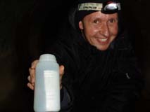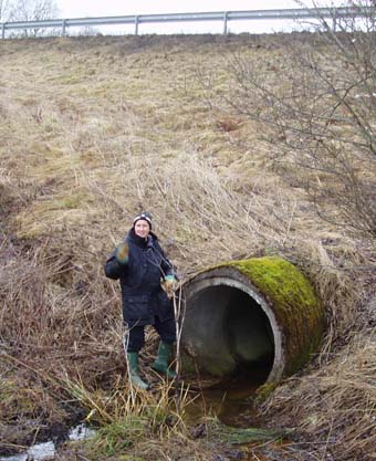 Hur långt (lågt) kan man gå i jakten på en cache? Här gällde det att böja på ryggen och inte vara rädd för vare sig trånga utrymmen, vatten eller lera. Hallén gick först in följd av Fiabus. |