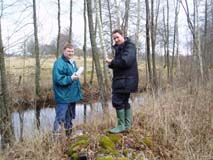 På väg mod ”Pond” såg jag två figurer gå runt och leta på ett sätt som nästan bara geocachare gör. De var dock en bit från den plats dit jag var på väg. När jag öppnat lådan, hade loggat och höll på att skriva ned koordinaterna till nästa så dyker det upp två personer bland enbuskarna. Det visar sig vara RedHawk med hustru. De letade inte allt efter ”Pond” utan trodde att de hittat Center of Hisingen, efter lite inledande förvirring lyckades vi reda ut begreppen! |
