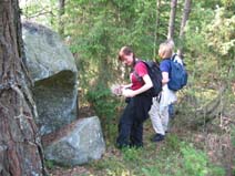 Åter hindrades vår väg av sankmarker men det gick när man metodiskt letade sig fram! Väl på plats hittade en av nybörjarna cachen. | |||