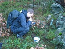 Början av vägen gick lätt, men sakta men säkert närmade sig vattnet stövelskaften, för att slutligen orsaka översvämning. Det blev till att dra av stövlarna och försöka torka så gott det gick! O – hade med sig extra strumpor så vi klarade oss ganska bra trots allt och kunde lättade logga även nr 3. Det var något mindre med vatten i skogen därefter så vi kunde ta oss fram i normal fart igen, så normalt som man nu tar sig fram i stiglöst land!