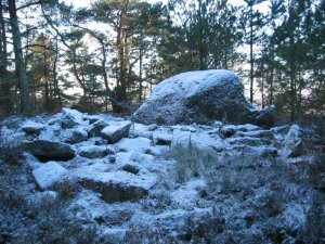 Men den var lätthittad och jag styrde stegen mot ”Högens berg”, ett berg med både en cache, micro av någon anledning, samt ett bronsåldersröse. Detta röse är byggt kring ett flyttblock, lite annorlunda. Berget är helt klart sevärt, nedanför låg förr Högens gård, som hade laxfisket i Säveån, vid gården fanns dessutom en gravhög, som man kan misstänka var från järnåldern. Vid detta berg har alltså funnits bosättningar i flera årtusenden. När man besöker sådana platser blir geocaching verkligen meningsfullt. Stannade en stund på berget och åt ytterligare en smörgås.