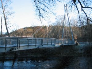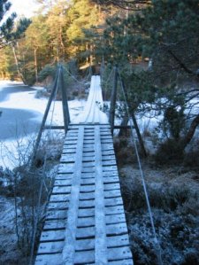 Nu var det en bit till nästa, ”Space Bridge”. Här gjorde jag en miss och tänkte ta en genväg, men den ledde mig ut i mossar och kärr. Envis som man är så vände jag inte utan fortsatte ut i snåren, gav mig en rejäl omgång, så man skall inte klaga! Tillslut kom jag åter på Bohusleden och bron var snart inom synhåll. Det är en rolig bro som gungar, svänger och hoppar när man går på den! I kylan så brakade det ordenligt i virket dessutom! Jag fattade omedelbart att jag måste under bron för att hitta en small. En snygg liten låda hade byggts åt cachen – en riktigt snygg gömma!