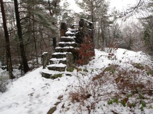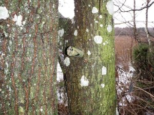 Nu skulle man ut i skogen! Kungsbacka skogen för att vara exakt, där låg fem burkar och bara väntade på att bli loggade. Jag hade sett att det fanns stigar i närheten av samtliga burkar och min strategi var att hålla mig till dessa i det längsta, snön låg djup och man vet aldrig riktigt vad som döljer sig i djupa snöhålor. Första målet var "Kungsbackaskogen #1 Vattentornet", efter ett kort sökande hittades denna lilla burk! Glad och styrkt av detta gav jag mig på "Kungsbackaskogen #5 Berget", men där misslyckades jag, kan inte begripa var den burken låg! Surt, men det var bara att ta nya tag och leta sig mot "Kungsbackaskogen #4 Stigkorset", där hade jag bättre lycka. Trots att det var en micro i skogen så hittade jag den omedelbart – lycka! Stigen ledde mig nu mot "Kungsbackaskogen #3 Svartemosse", men jag lyckades tappa bort den igensnöade stigen! Men man hittar ju fram ändå, hade sett på tidigare loggar att man hade haft problem med denna burk. Jag snurrade lite innan jag fick syn på något mystiskt på ett träd…