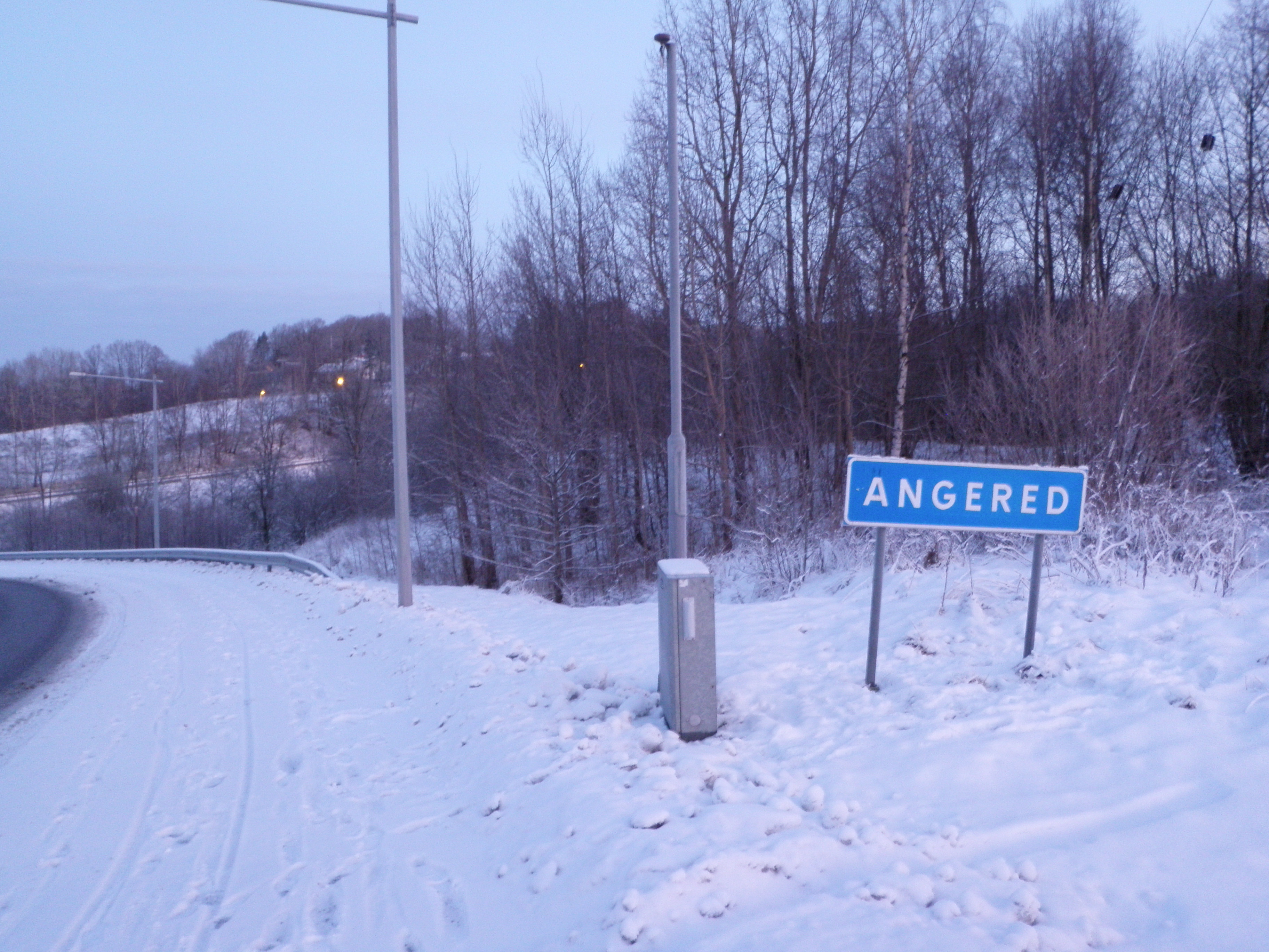 Det var inte varmare idag, tvärtom! Termometern denna morgon visade på minus 15, det var många år sedan vi hade så kallt i Göteborg. Kylan hindrade givetvis inte min cachingrunda, redan före gryningen var jag iväg mot nya mål, denna gång Lärjeåns dalgång. Buss 520 stannade något hundratal meter från den första cachen på dagens runda ”Angered”, det var ganska snabbt uppenbart var cachen skulle vara. Men att arbeta med bara händer nära metallytor i denna kyla kändes, fick avbryta, värma händerna, och börja igen. Då fick jag fram cachen och kunde logga. Lite längre uppåt vägen ligger en multi, men den var inte med i dagens planering, den lär nämligen vara lite svår under långt bättre förhållanden än dagens, så jag låter den vara tills det blir varmare igen.