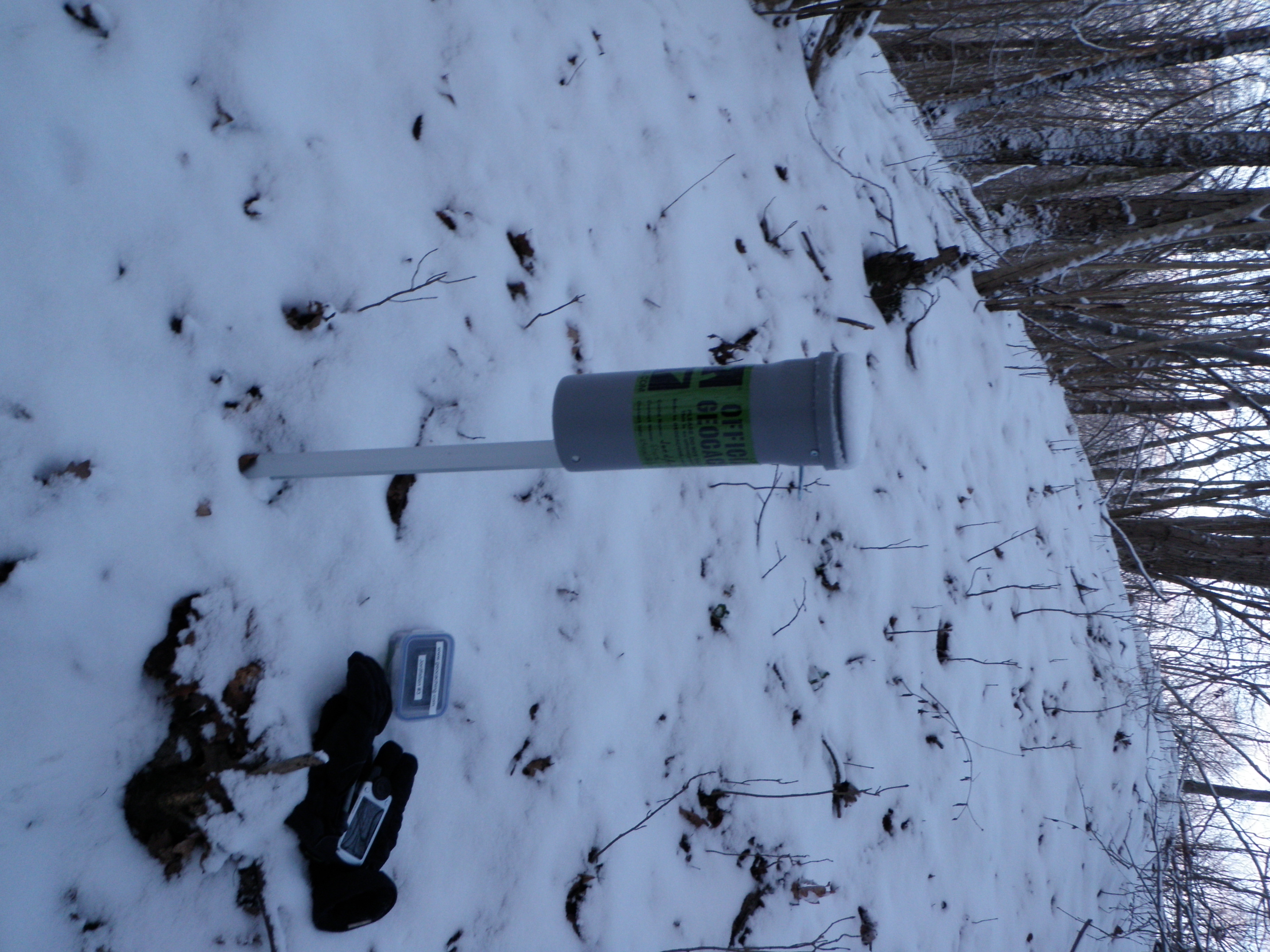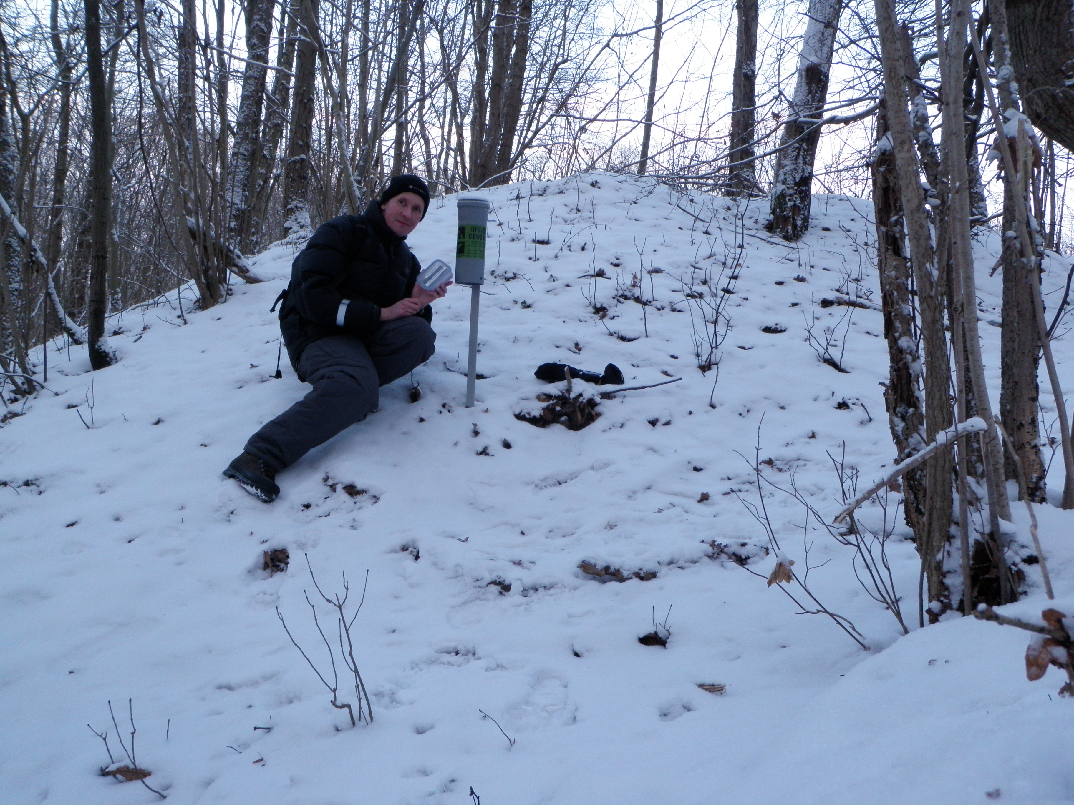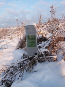 Vandringen gick nu mot ”Jordfallen #1”, redan på långt håll fick jag syn på en bekant burk, om än mer infrusen än den första jag såg i denna serie! En lätt logg blev det och jag kunde nu börja leta mig en väg ut från dalgången. Det hade varit en mycket fin vandring, trots kyla, mina nya kängor satt perfekt och fungerade utmärkt. Men nu var det dags att bege sig till ett industriområde för att plocka ”XMAS2009 – Tribute to dogs”. Den var snabbt avklarad och jag kunde ta mig bort till spårvagnen och återvända mot cachingbasen.