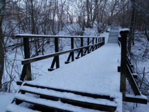 Lite längre fram och några hundra meter ut i terrängen låg ”Jordfallen #3”, ledtråden fick mig först att tro att cachen kunde ligga under en sten eller rot, men det var fel, helt fel. Det visade sig vara en mycket snösäker burk, helt öppen placering, men snygg – mycket snygg! Jag fortsatte nu mot ”Jordfallen #2”, en cache där det varnas för att kläderna kan bli leriga. Men idag när allt var djupfryst fanns inte något med lera! Bara lite snö och is på jackan, annars gick det lätt och enkelt att ta sig in under bron och logga burken.