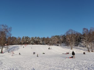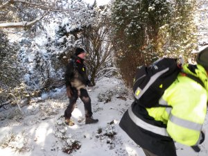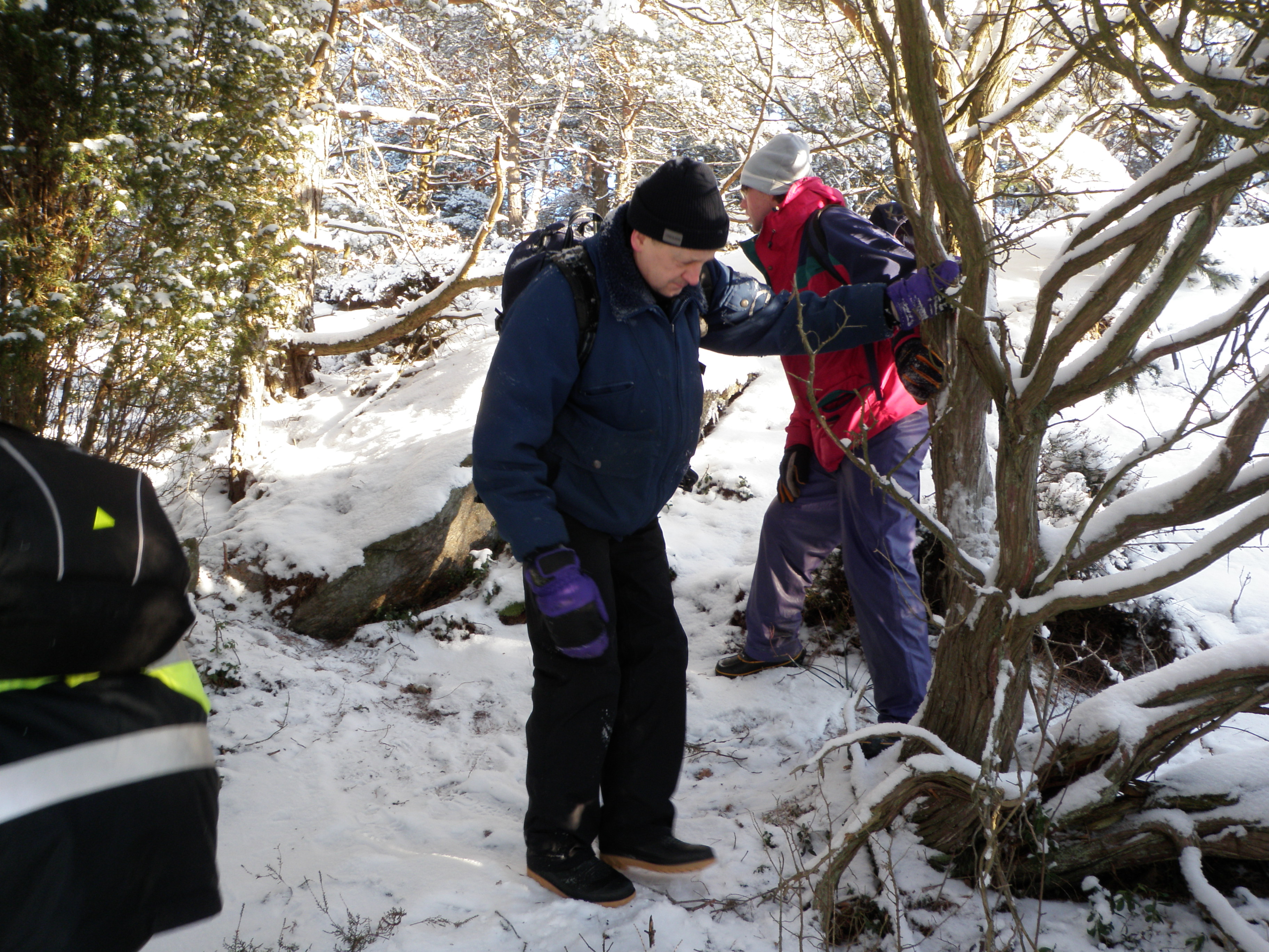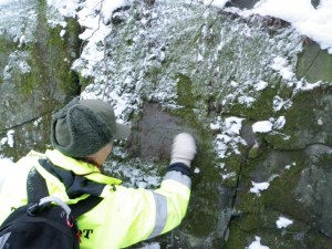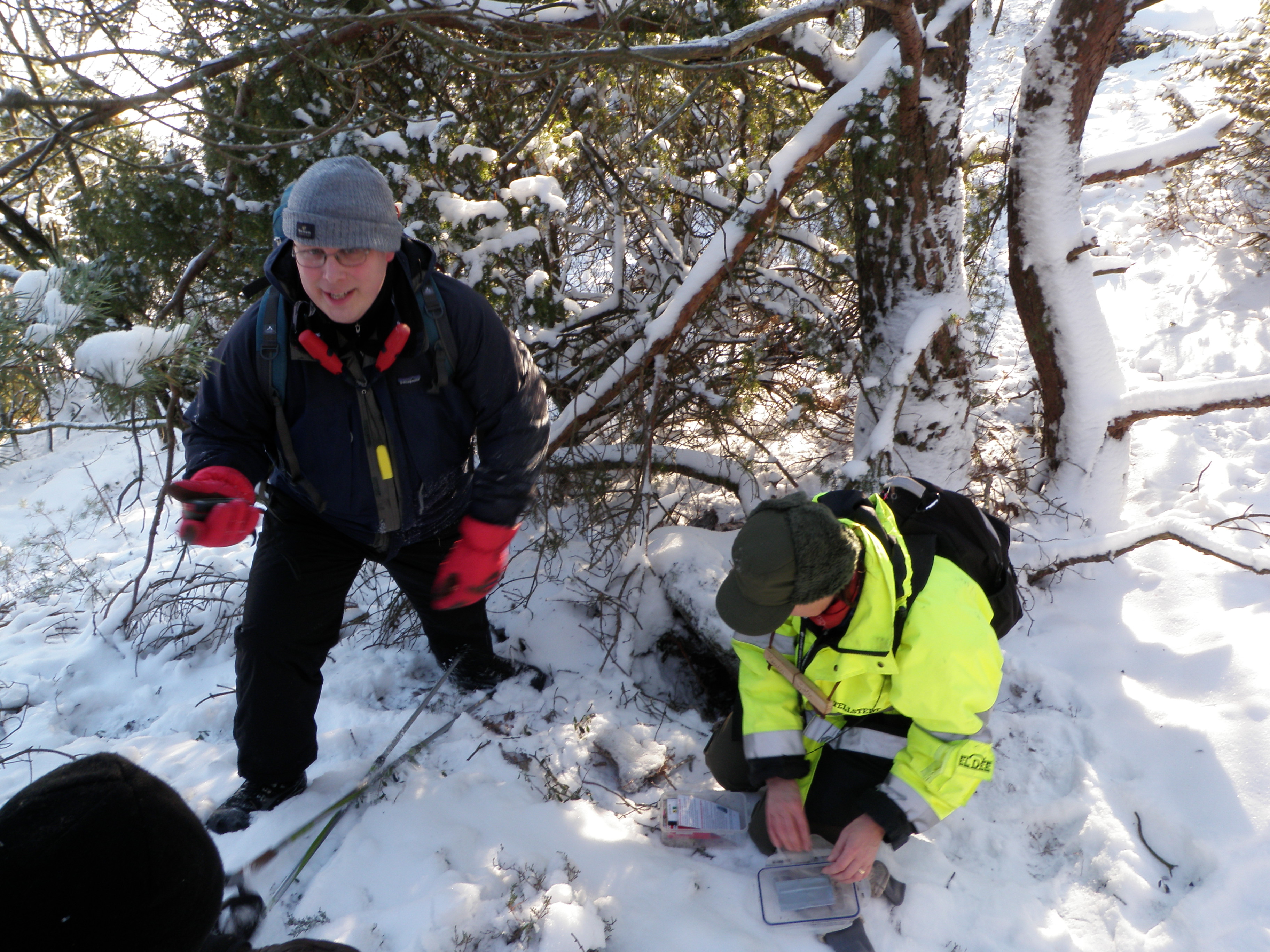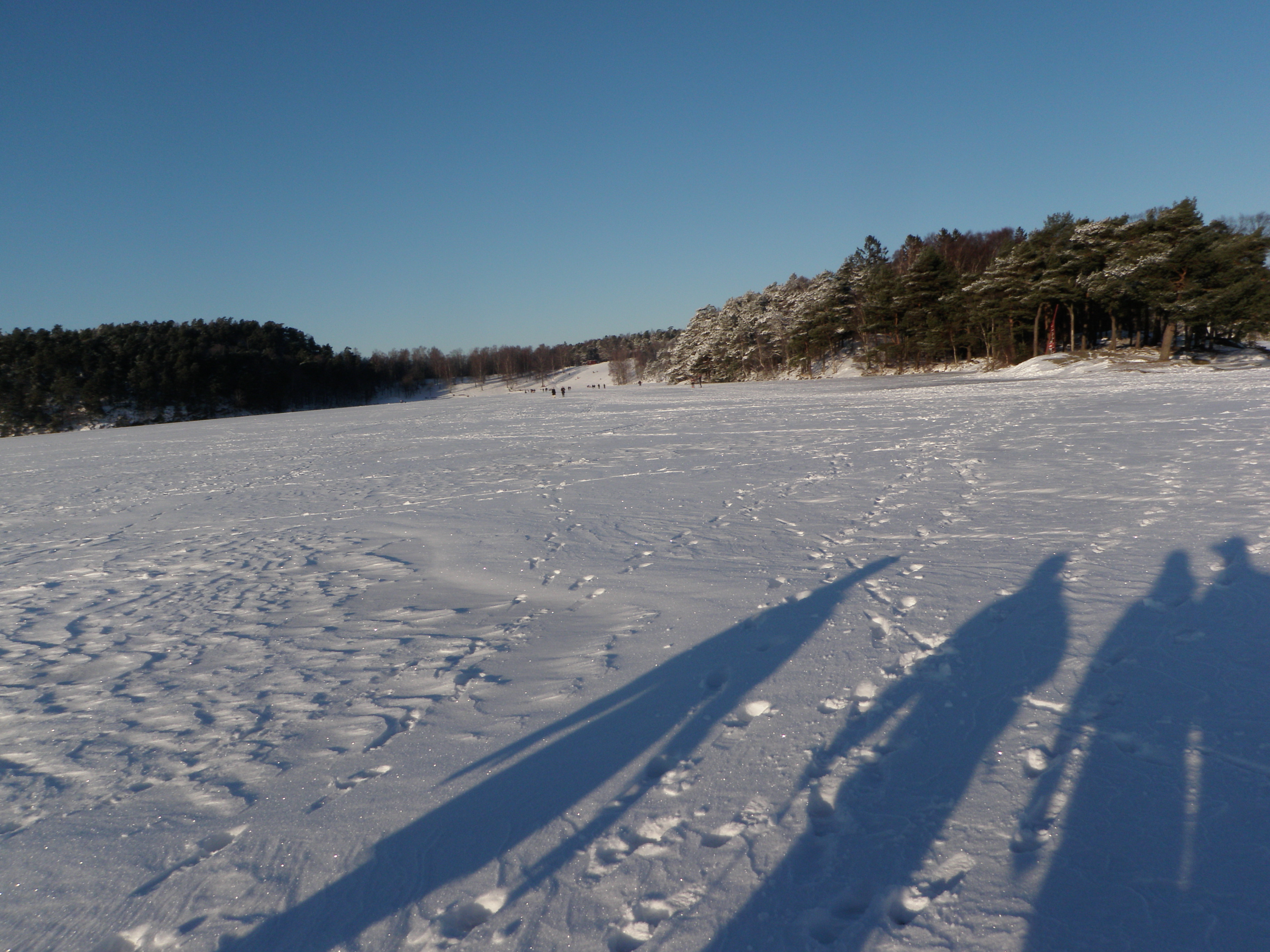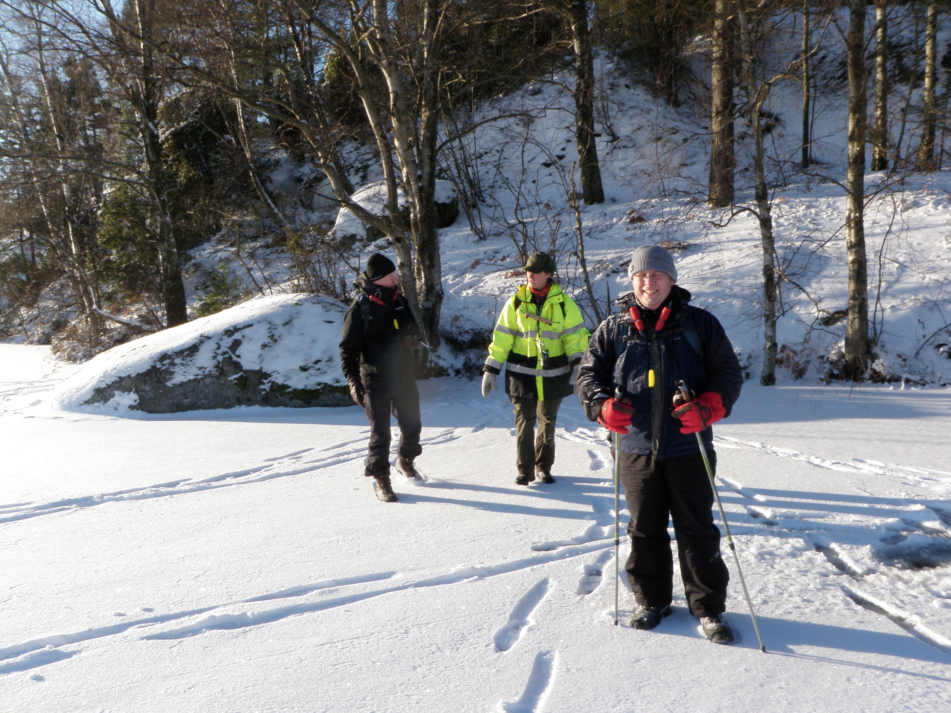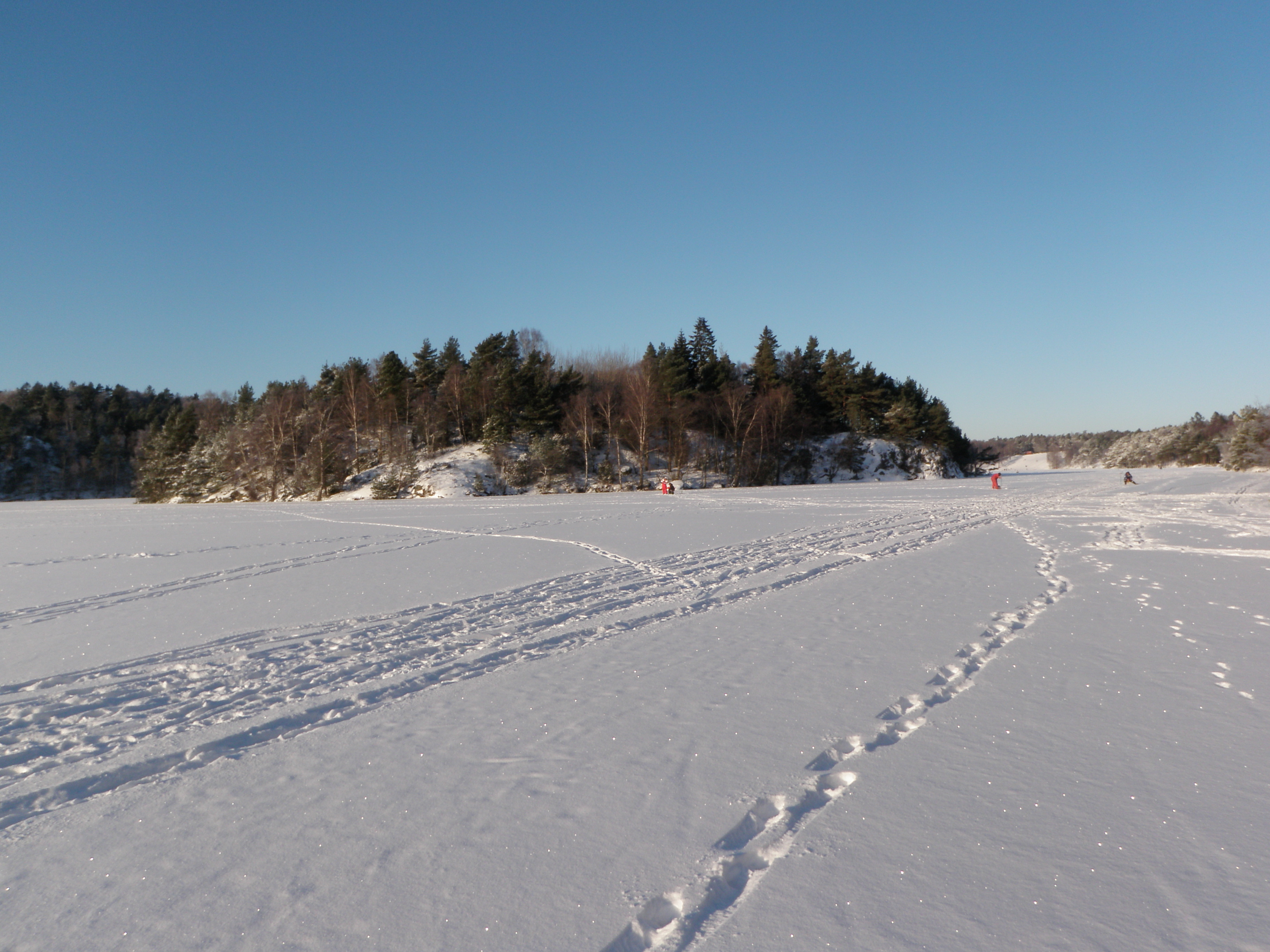 Vi fick en trevlig pratstund innan vi gick mot nya cacher. Nu skulle vi korsa den tjocka isen över mot Delhuvudet, eller Storön som den också kallas. Det är ganska fantastiskt att tänka sig att denna ö är en skapelse av människohand! Före år 1777 var Delsjöns yta nästan 6 meter lägre än idag, då byggdes en kvarndamm på den plats där det ännu finns en damm – där kanotuthyrningen idag finns. Innan G.B. Santesson (han var även betydelsefull köpman i Göteborg som gjort sig en förmögenhet under sillperioden) på Kärralund lät höja Delsjöns yta var Delhuvudet en del av en barriär mellan Delsjön och Lilletjärn som sjön söder om Delsjön hette. Ön är alltså relativt ung, därför finns inte något bättre namn på den än Delhuvudet eller Storön. Denna förändring av Delsjöns yta är ganska obekant, även om jag gjort mitt bästa för att sprida informationen via min bok ”Storstadens utmark”.