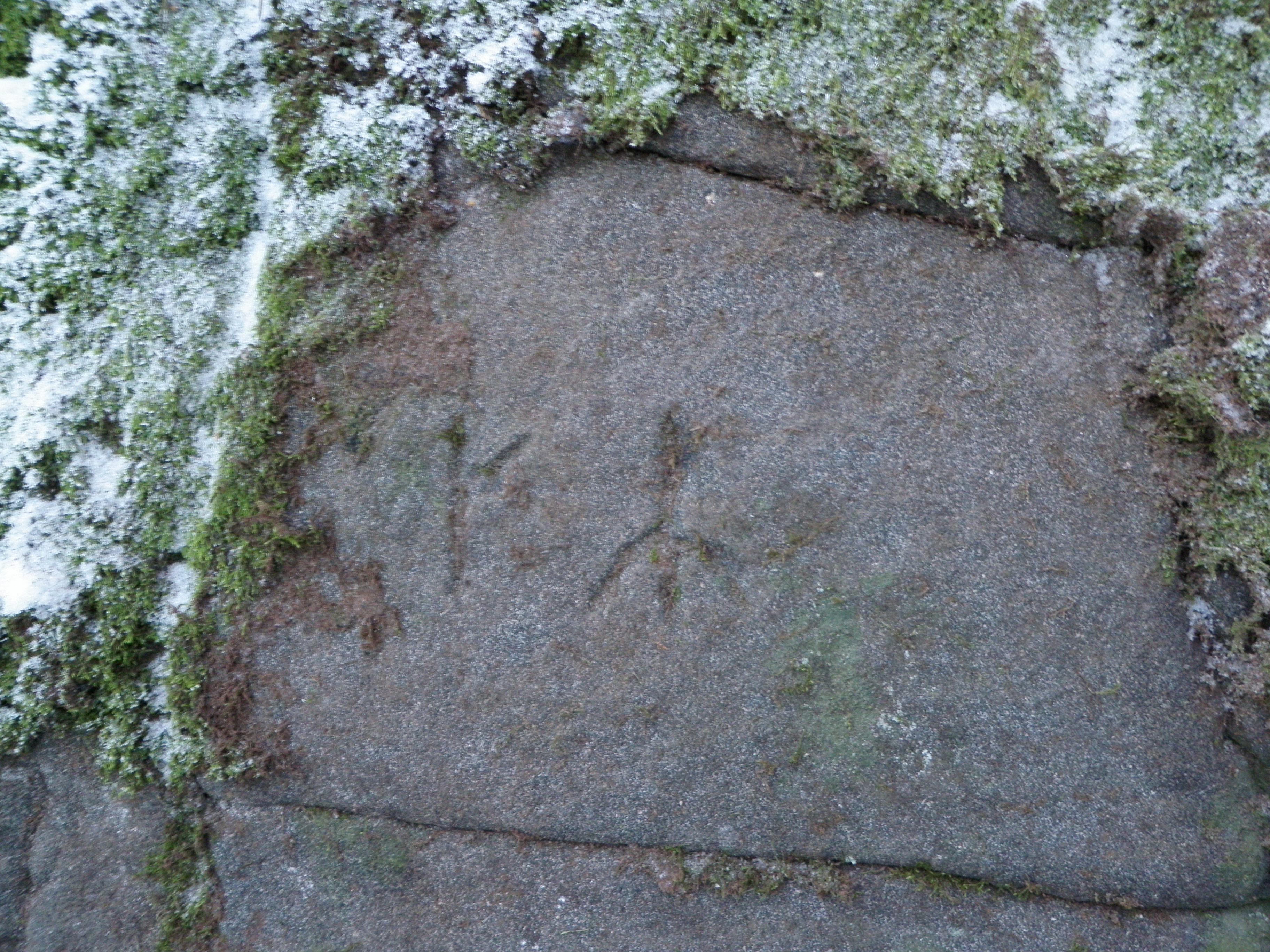 Vårt sökande lönande sig, koordinaterna var ganska bra för att vara inlagda på gammaldags sätt!! Det fanns inte många berghällar att välja på, efter lite letande under mossan framträdde ristningen. Vi var de första som såg ristningen sedan den senaste inventeringen 1973, jag måste säga att denna upplevelse var stor, långt större än någon cache! Visserligen inte någon förhistorisk ristning, men den är faktiskt snart hundra år och har på sitt sätt blivit en del av områdets historia. Har du vägarna förbi Delhuvudet finner du ristningen på: N57 40.932 E12 02.520 enligt RAÄ, men enligt min GPS var detta något fel, enligt min GPS var vi på: N57 40.927 E12 02.508.