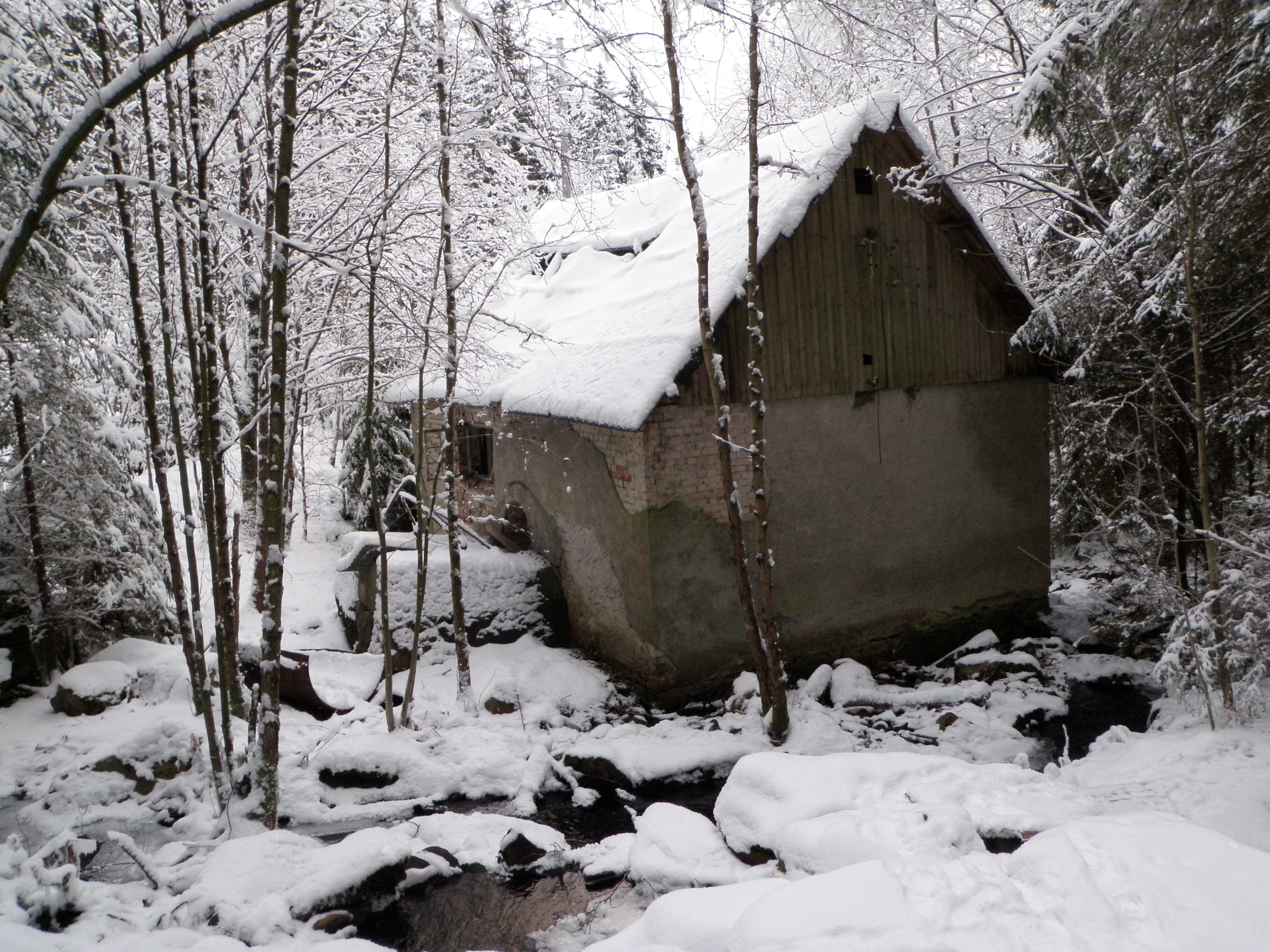 Istället gick vi tillbaka, det blev en fika med eftersnack. Därefter åkte vi åt olika håll. Hallén, TMR68 och bgr01 gjorde sällskap på en liten extratur som tog oss ut på nya äventyr. Den största upplevelsen var nog besöket vid ”Old Mill #1”. Jag har loggat flera cacher i den serien, men vid denna plats fanns det riktigt mycket kvar av kvarnbyggnaden. Dessutom fanns det fantastiska isskapelser i det forsande vattnet nära kvarnen.