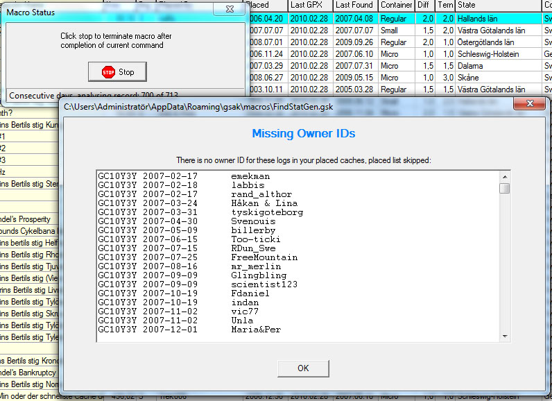 I min profil på GC.com brukar jag lägga ut månadens statistik, trevligt med kartor och diagram! Men under början av 2010 har allt som kan krångla krånglat. När man försöker uppdatera loggarna på sina egna cacher står maskinen och tuggar i en evighet, lägger till Owner ID efter Owner ID, idag ägnade jag 4 timmar åt sådan uppdatering, och vad händer när man sedan skall köra statistiken genom GSAK:
