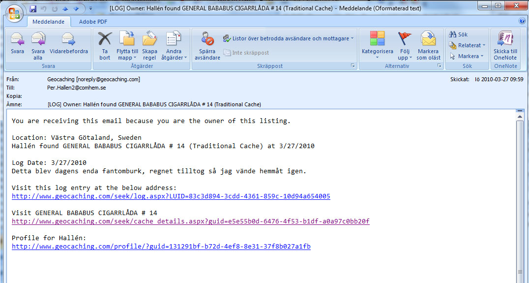 När felet sedan rättas till och cacherna är tillbaka hos rätt ägare, kan man ge sig ut på en tur och logga dem.