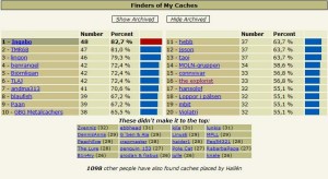 I topp av listan hittar vi Ingabo som plockat 82,7% av mina burkar, strax efter med 81,0% ligger TMR68, även Lingon, benrangel och Björnligan ligger bra till. GBGMetalcachers har kommit starkt och ligger nu på 10:e plats. Lite längre ned i listan hittar vi utmanare i form av hebb, jsson samt the explorist som är flitiga jägare av Hallénburkar!