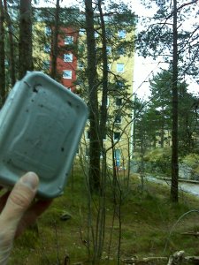 Idag fick det bli en blixtvisit i Kortedala för att rensa lite burkar som vuxit upp där likt svampar ur jorden. Jag tog 6:ans vagn ända till ändhållplatsen, lämpligt nog fanns där en burk, ”Avstigning 6:an”. Jag klev av lite väl långt fram och fick gå tillbaka hela 20 meter…! Men väl där fick jag snabbt syn på burken. När man tog av sig handskarna kyldes fingrarna ned på några sekunder i det nollgradiga och mycket blåsiga vädret. Det var skönt att få loggat den och börja röra på sig igen. Endast ett kort stycke bort fanns nästa cache, en av de många kyrkocacherna här i Göteborg. Undrar om någon kommer att försöka sig på att genomföra denna ”kyrkovandring” i sin helhet någon gång, den bör bli ganska lång. Oftast brukar kyrkocacherna vara micros bakom skyltar eller liknande, men inte denna! Här var det lite lurigare, men jag löste problemet och fick mig min logg.