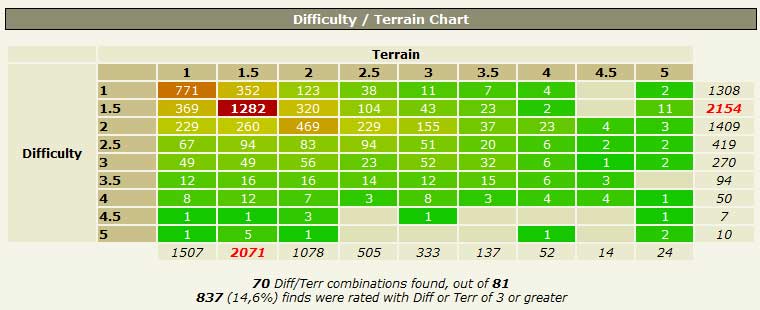 Statistiken uppdateras med jämna mellanrum, ungefär en gång i veckan, på min profil på geocaching.com. Vid denna uppdatering skedde det en del glädjande förändringar. Tack vare söndagens logg gick jag från 69 D/T kombinationer till 70.