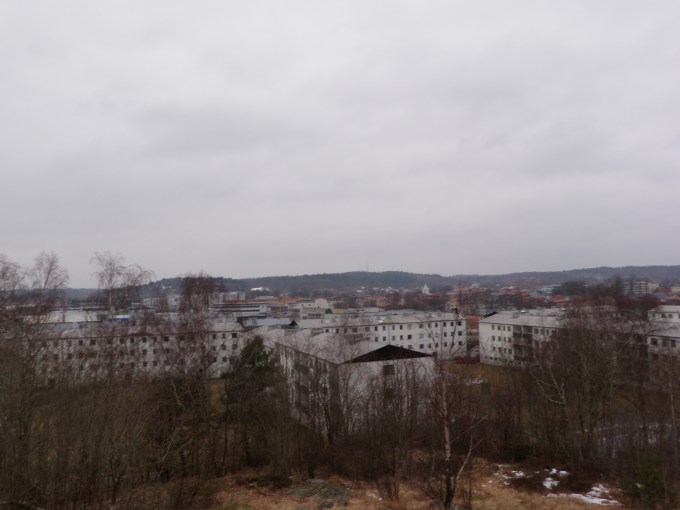 Den närmaste bebyggelsen var väl inte någon större upplevelse, men ändå, det var ett ganska bra utsiktsberg. Lådan kunde hittas blixtsnabbt, men när jag höll på att logga hörde jag röster som närmade sig. Det var en pappa och en liten flicka som jag passerat på gångvägen nedanför berget. Nu var båda två på väg upp för sluttningen. Jag fick snabbt undan lådan och ställde mig på berget och började fotografera. Den lilla flickan, inte mycket mer än en halvmeter lång, stegade fram till mig och frågade med ovanligt klart tal för ett så litet barn, om jag sett några ugglor! Sedan följde flera ugglefrågor – nästan så jag började ana ugglor i mossen! Tydligen är det så att det i området finns ugglor som samlar på nappar, mycket skall man höra. Detta var utan tvekan dagens mest oväntade händelse.