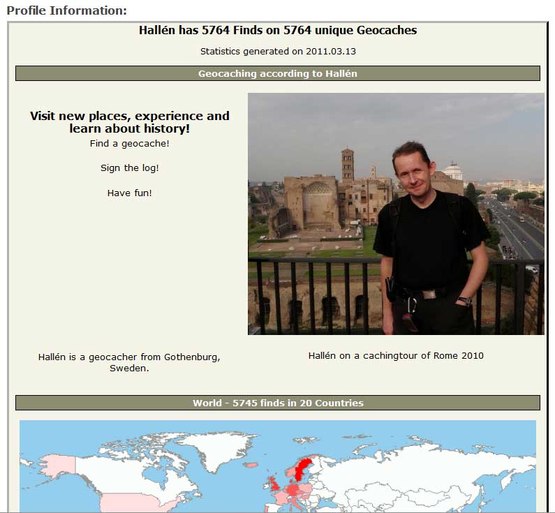 En ny vecka har inletts och det var dags att uppdatera statistiken på gc.com, alltså min profilsida. Det första steget togs idag mot att förnya och förbättra profilen. Den skall inledas med en kort presentation, idag finns bara några stolpar, men snart kommer mer att införas ovanför de viktiga kartorna över världen och Euorpa. Utmärkelsernas tid är nu förbi, de kommer inte tillbaka på min profil. Istället tänker jag mig att förutom en presentation av Hallén högst upp i profilen, även länka till några av mina favoritcacher som jag hittat.