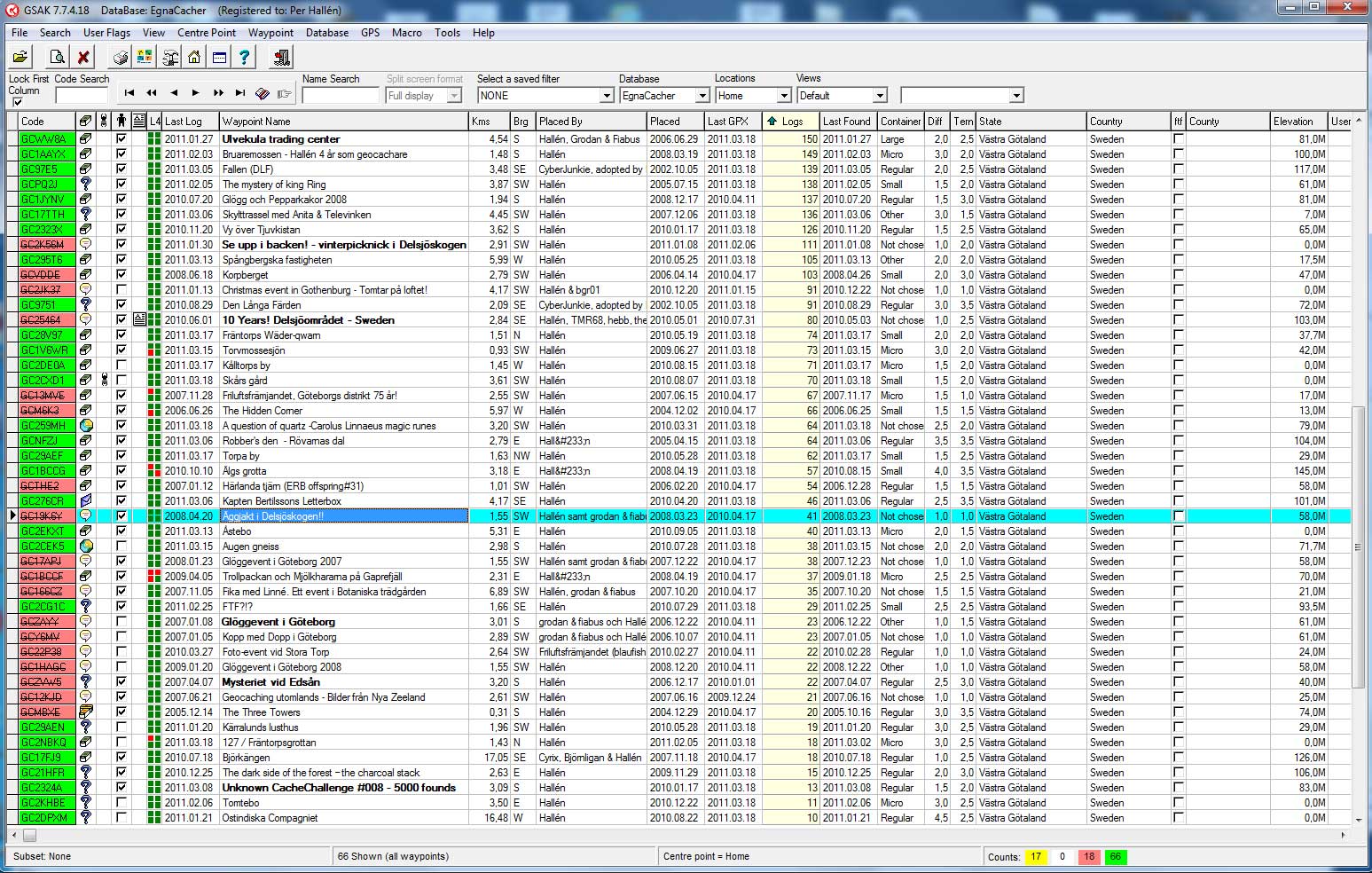 Ett alternativ till att skapa kartan i Google maps är att använda ett annat macro till GSAK, Myfounds2html.gsk. Det fungerar utmärkt på mindre databaser, men om du försöker köra det på en databas med flera tusen cacher lär det bli problem. Då kommer det att dröja många och långa minuter innan kartan syns på webben.