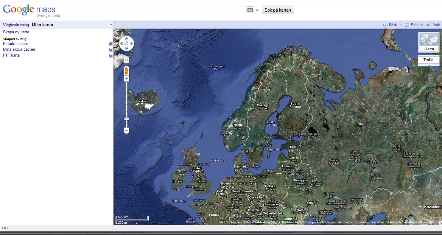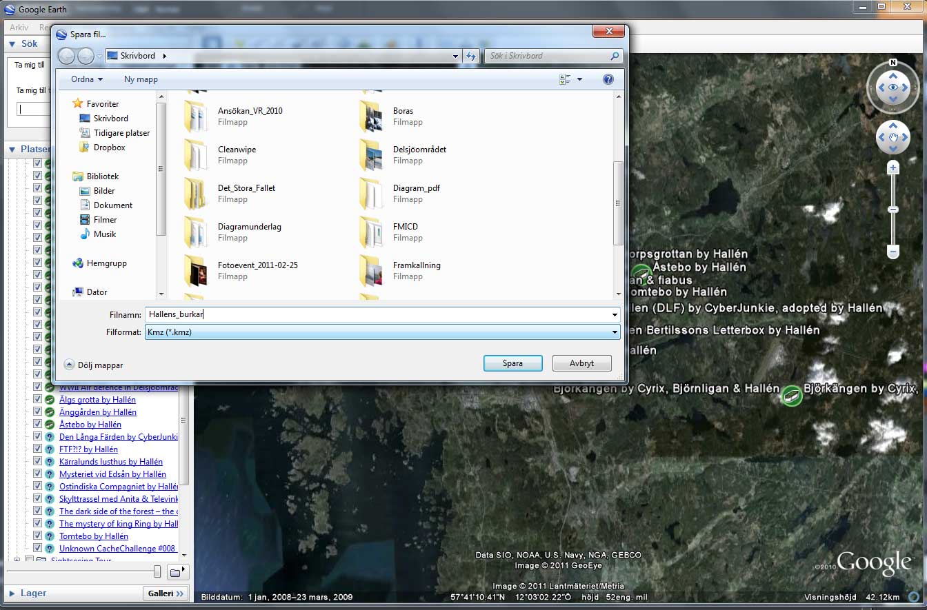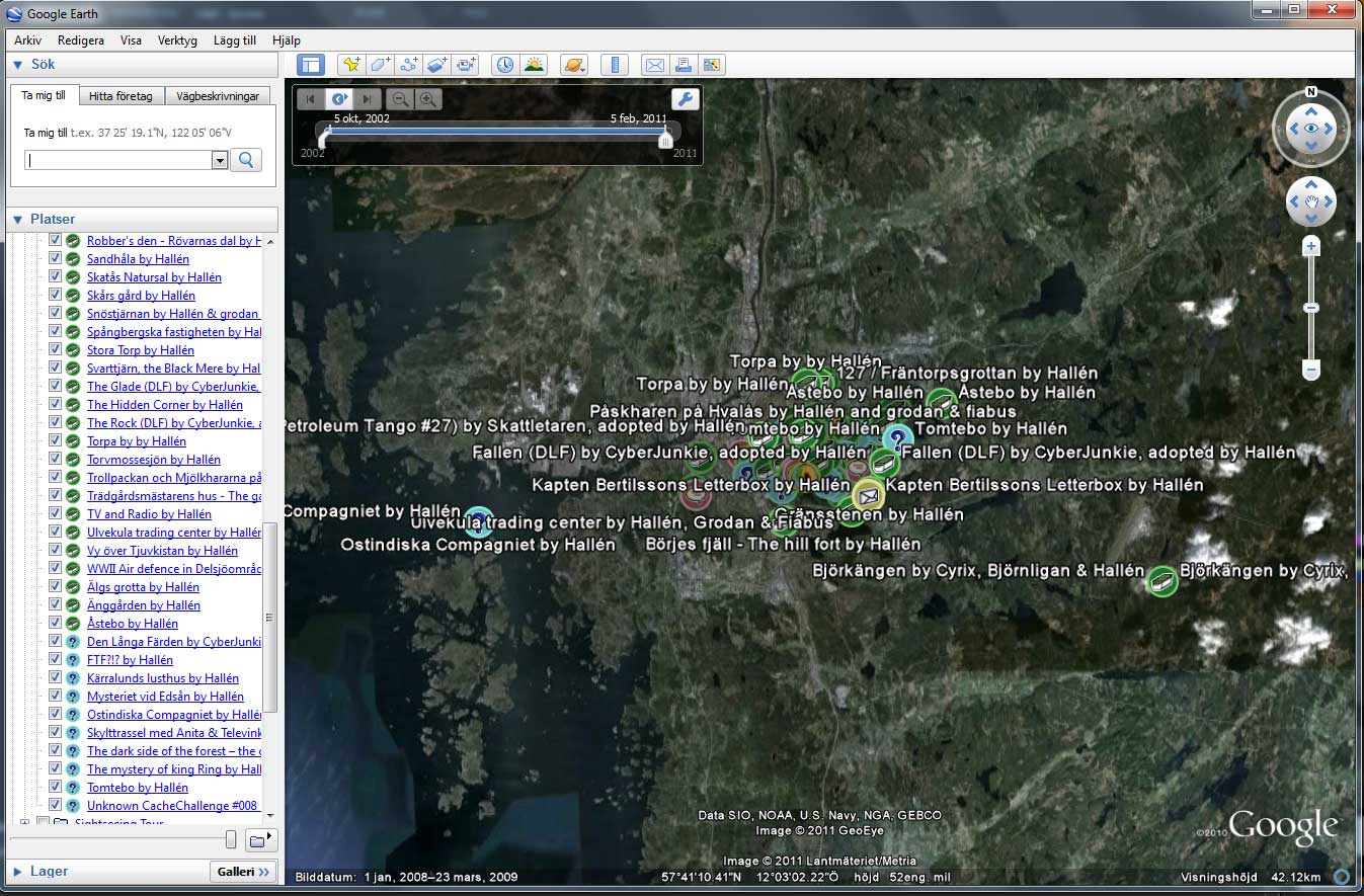 Efter några sekunder startar Google Earth och du ser databasens cacher på kartan.