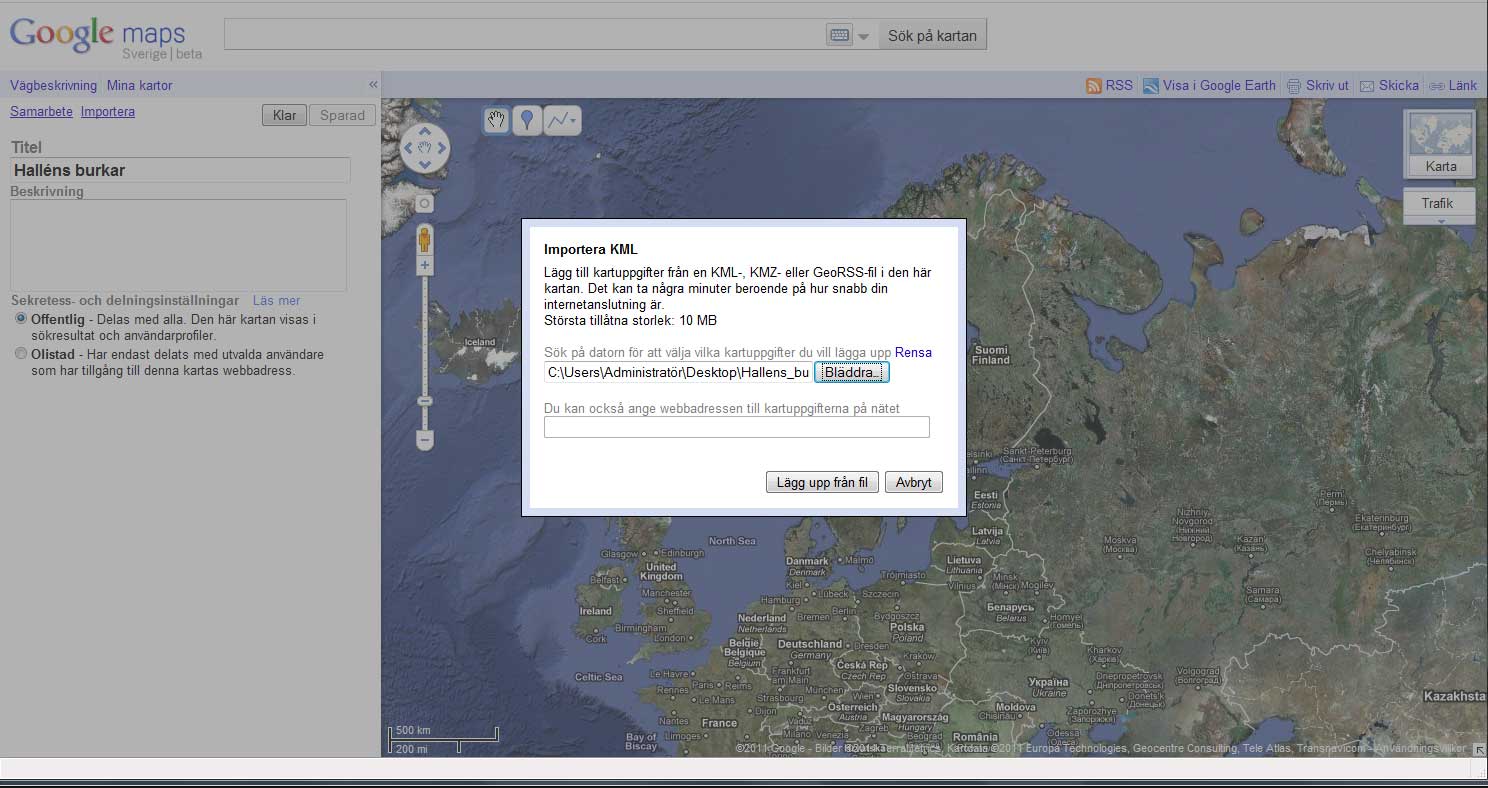 Välj nu importera och leta upp din kmz fil på din dator.