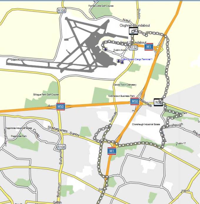 Det har sagts att det finns något som kallas ”Hallén tidigt”, men startpunkten fredagen den 15:e april var tidigare än ”Hallén tidigt”, avfärd 4.30… Då träffades Hallén och hebb för avfärd mot Landvetters flygplats och vår resa mot Dublin. Men det går ju inte att lämna landet utan att först plocka en burk, så det blev ett kort stopp på väg mot flygplatsen. ”Near Highway #2” plockades i kolmörker, sedan kunde vi nöjda checka in och gå till vårt flygplan. Det blev en kraftig försening denna morgon, allt på grund av dimma i Köpenhamn. Vi fick först vänta och vänta på Landvetter, sedan cirkla runt, runt och runt över Köpenhamn. Det långa uppehåll som vi hade räknat med i den danska huvudstaden försvann snabbt och det blev därmed inte någon flygplatscache, vi fick istället gå direkt till nästa plan, som faktiskt var i tid och på utsatt tid lyfte vi mot Irland.