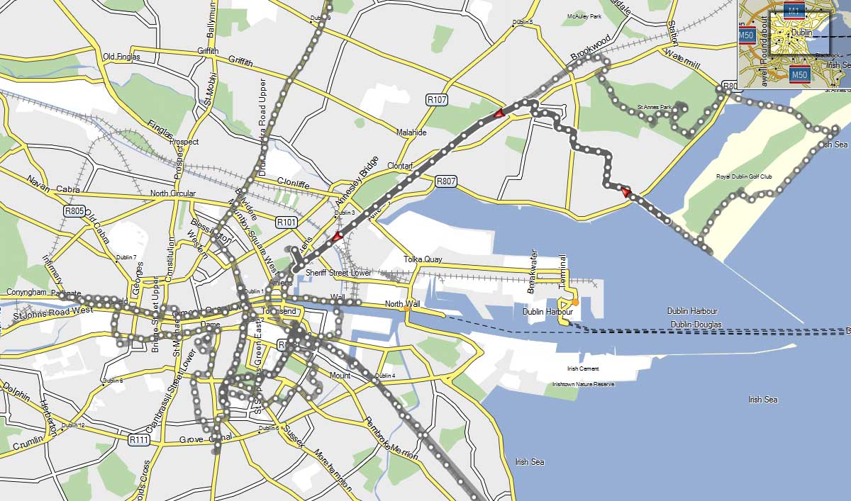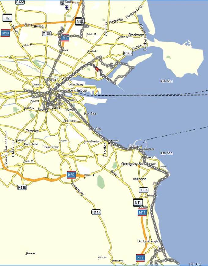 Klockan var strax efter nio på kvällen när vi avslutade cachingrundan, då var centrala Dublin så gott som rensat på cacher. Endast en del svårlösta mysterier och långa multis fanns kvar i trakten. Spårloggen visar att vi ändå gick fram ganska effektivt i staden.