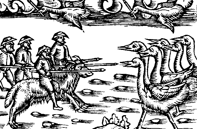 Efter att ha utrustat en expedition med skidor, renar och kameler återstod frågan om hur man skulle ta sig i riktning mot Skrickfinnarnas land. I Norden har vi som tur är jättelika fåglar att ta till när vi skall ut och resa. Dessa har länge varit ett problem, män till häst försedda med långa lansar fick under lång tid bekämpa jättefåglarna.