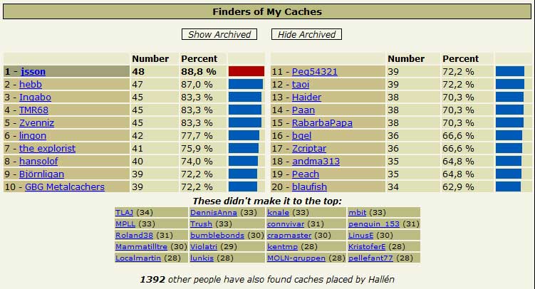 Varför ta bort de arkiverade cacherna ur statistiken ?? De har ju också hittats en gång ! Verkar som om dom blivit devalverade dvs mindre värda…….