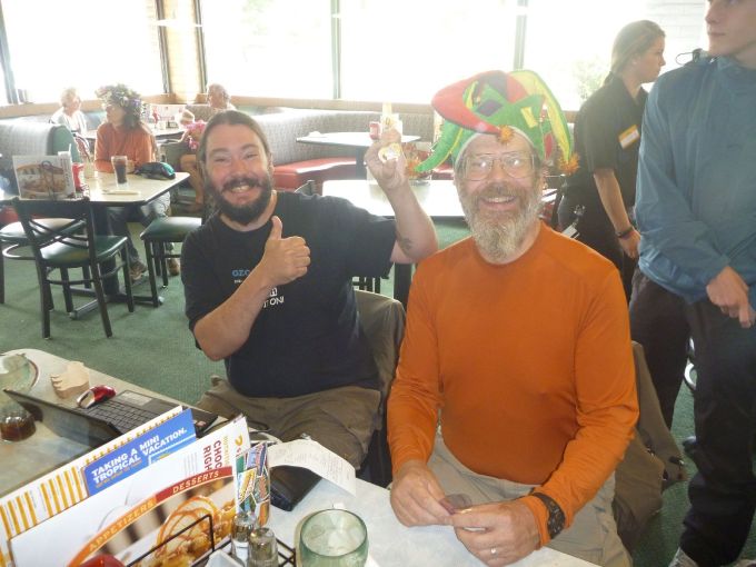 Här fanns det inte någon risk för en DNF! Vi skulle hålla i vårt eget event ”Meet and greet Swedes – lunch near SeaTac!”, på Denny’s omedelbart intill flygplatsen. Vi anlände en kvart före starttid och gick in för att beställ oss lite hamburgare. Efter en liten stund började det dyka upp geocachare från alla håll! En bit in i eventet kom även superkändisen Moun10bike som utlovat. Det blev ett riktigt kul event!