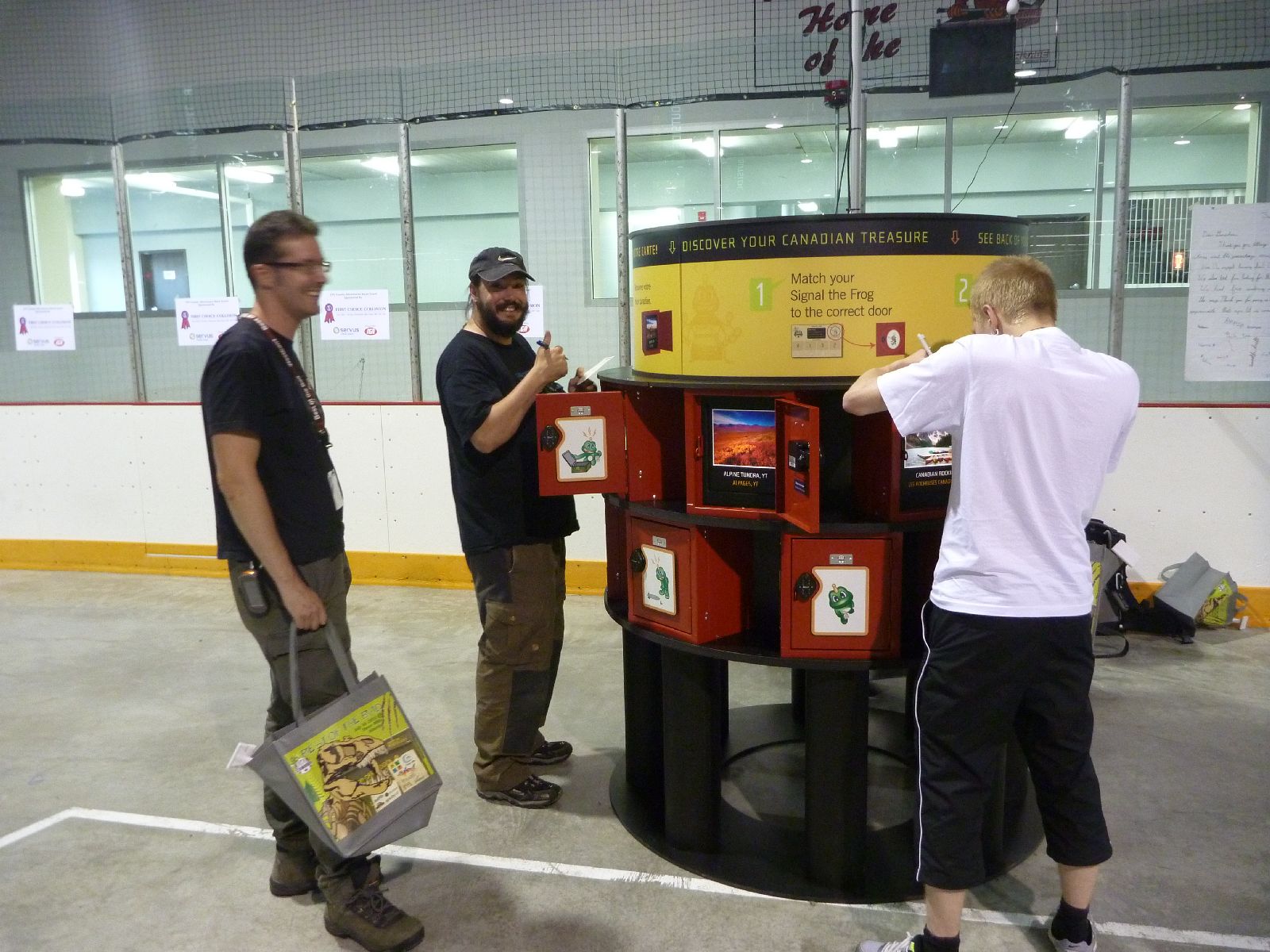 Dagens 12:e cachetyp verkade inte vara möjlig att uppnå… ”GPS Adventures Canada – Three Hills, Alberta” hade nämligen stängt innan vi nådde fram! Alla var nog lite deppiga över detta, inte nog med att A.P.E cachen hade arkiverats innan vårt besök, nu skulle vi inte heller få labyrinten. Men då träffade vi en av arrangörerna, Westrock-Bob, när han hörde om vårt mål och om hur nära vi var tog han med oss bakom scenen i idrottshallen, där låg den stora labyrinten. Vi fick en privat visning av utställningen – vilken LYX!