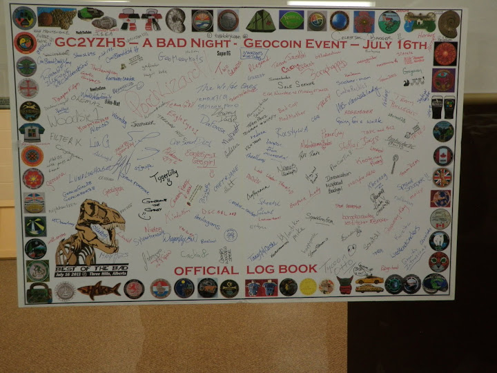 När vi anlände till Three Hills låg tältområdet öde, alla hade församlats i idrottshallen för dagens dos av underhållning inom ramen för ”Best of the Bad Mega Event (WestCan1)”. Vi gick också dit, lagom till att man höll på att räkna upp vilka regioner / länder som var närvarande. Från scenen kom då fråga var vi kom ifrån? – Sweden – jubel och applåder fick vi från flera hundra församlade geocachare! Vilket mottagande – och det var ändå bara början på den överväldigande vänlighet som kanadensarna visade oss.