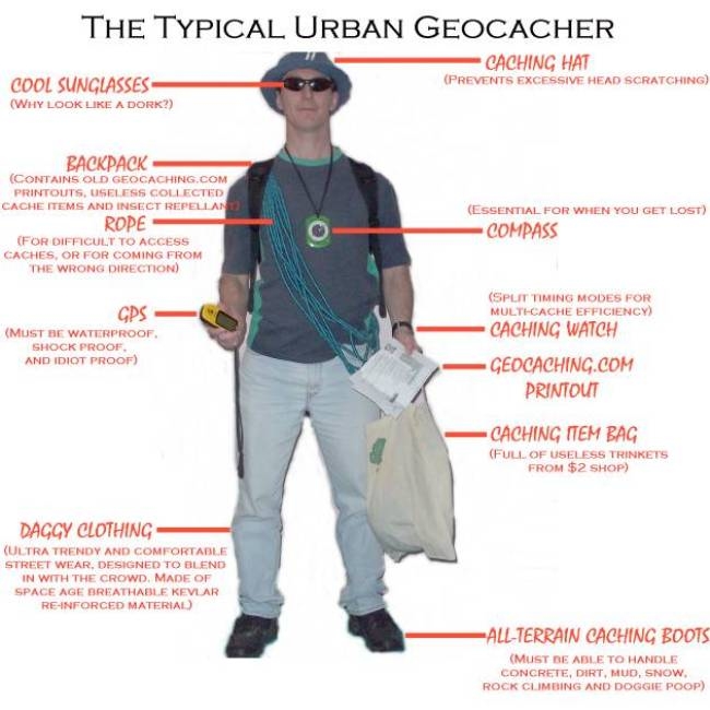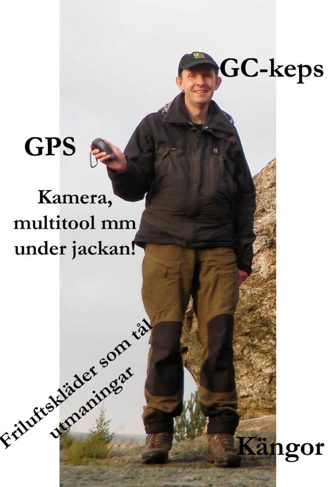 Vi börjar uppifrån, solglasögon – ja det kan man ibland använda men inte speciellt ofta. En ”caching hat” använder vissa, men vanligare är nog någon form av keps. Ryggsäck har man oftast för att få med allt som behövs under geo-promenaden. Rep, en mindre vanlig detalj hos den urbane cacharen, men det förekommer givetvis ibland. Kompassen på figuren ovan känns föråldrad då han faktiskt har en gps, även den känns lite gammal. Vad en Caching Watch är, vet jag inte, men det kanske någon läsare kan upplysa om! Mannen på bilden bär dessutom på utskrifter av cachesidor. Även det tillhör en gången tid då flertalet idag cachar utan papper. Klädseln hos vår exempelcachare verkar inte helt välanpassad inför ett seriöst cachingföretag, ljusa byxor skulle jag inte rekommendera. Men ”all-terrain caching boots” är ett bra val.