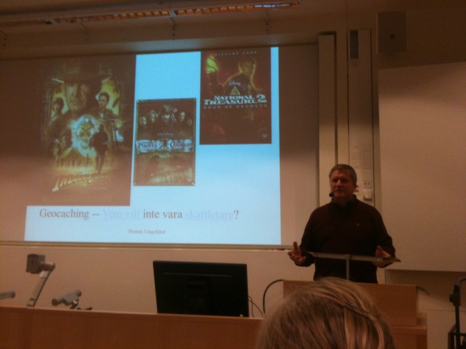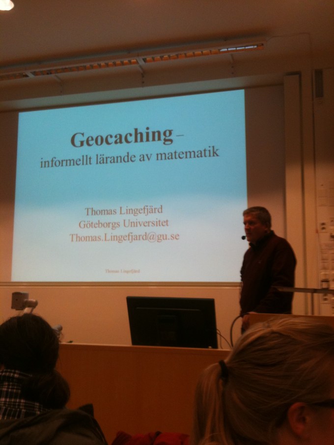 Torsdag eftermiddag var jag kvar länge på arbetet innan det var dags att gå den korta sträckan ned till Pedagogen för att lyssna på Thomas Lingefjärd (ThomasLinge) som skulle tala om skattjakt och informellt matematiklärande på en öppen föreläsning. Han har tidigare varit ute i media när vår personaltidning skrev om geocaching.