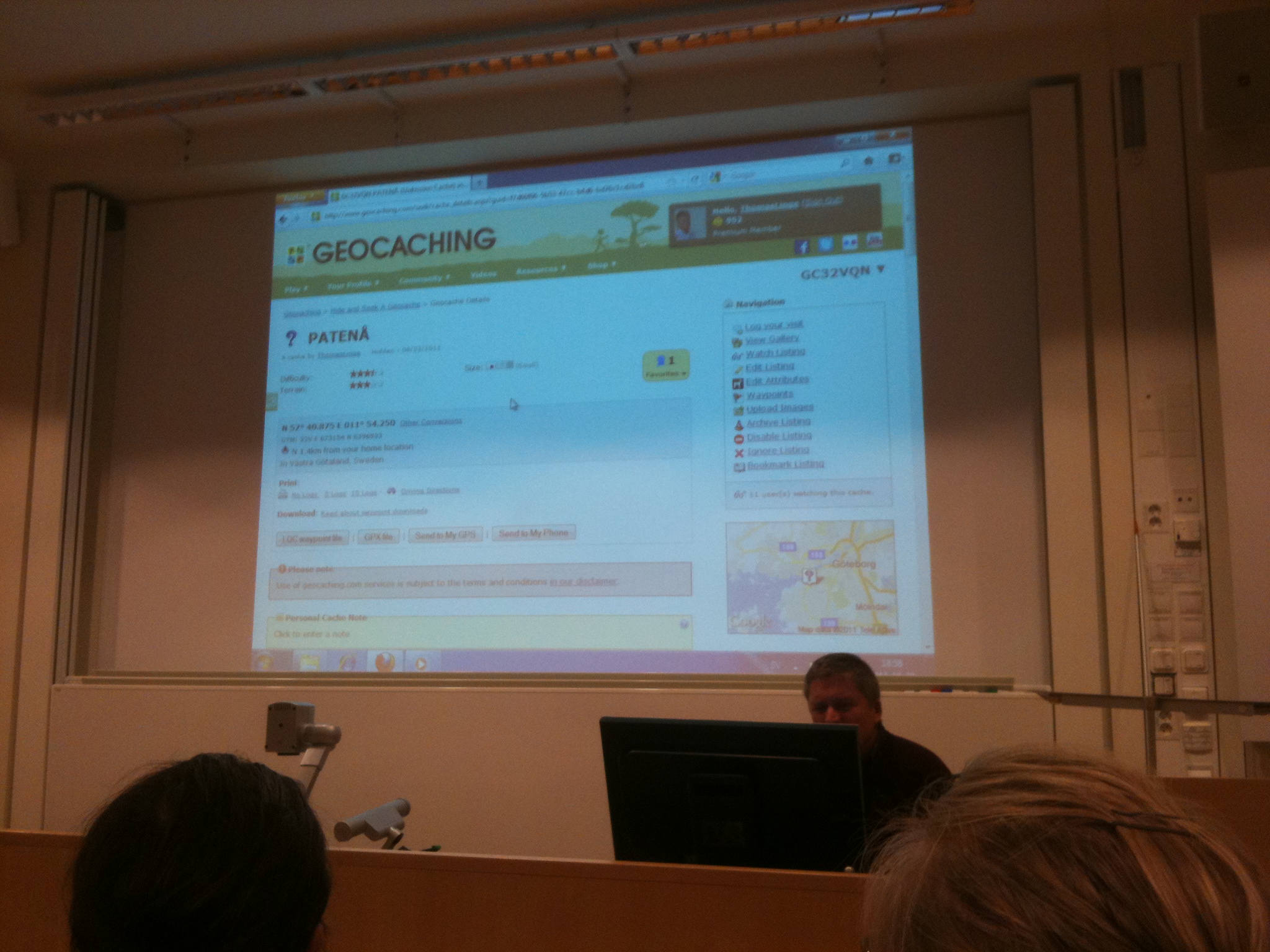 En bit in i föreläsningen kommer frågan, vad är egentligen en cache… från en man i publiken. Det var nämligen inte bara geocachare närvarande (Hallén, hebb, Team CC, jannie m.fl.), där fanns också de som troligen var mer intresserade av hur matematikundervisning kunde ha nytta av skattjakt.