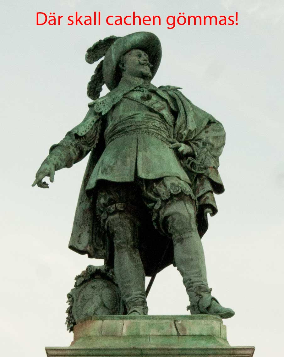 Igår var det den 6:e november, dagen då vi göteborgare har som tradition att äta upp stadens grundare! Men det är hög tid att vi omprövar hur detta med grundandet av Göteborg egentligen gick till. Tittar man noga på statyn av vår högt ärade Gustav som står på stadens Stora torg upptäcker man ett hemligt budskap, det finns ett meddelande som ger eko genom århundraden – Där skall cachen gömmas!