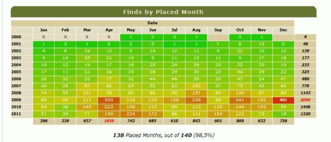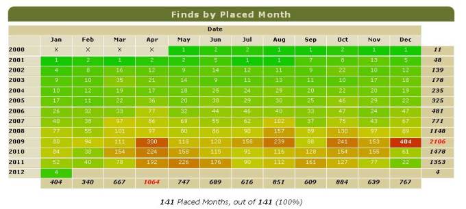 Händelserna kring hur 100% Finds by Placed Month erövrades har redan presenterats, återstår att visa förändringen när den nu är genererad via FindStatGen3 V4.3.04B.
