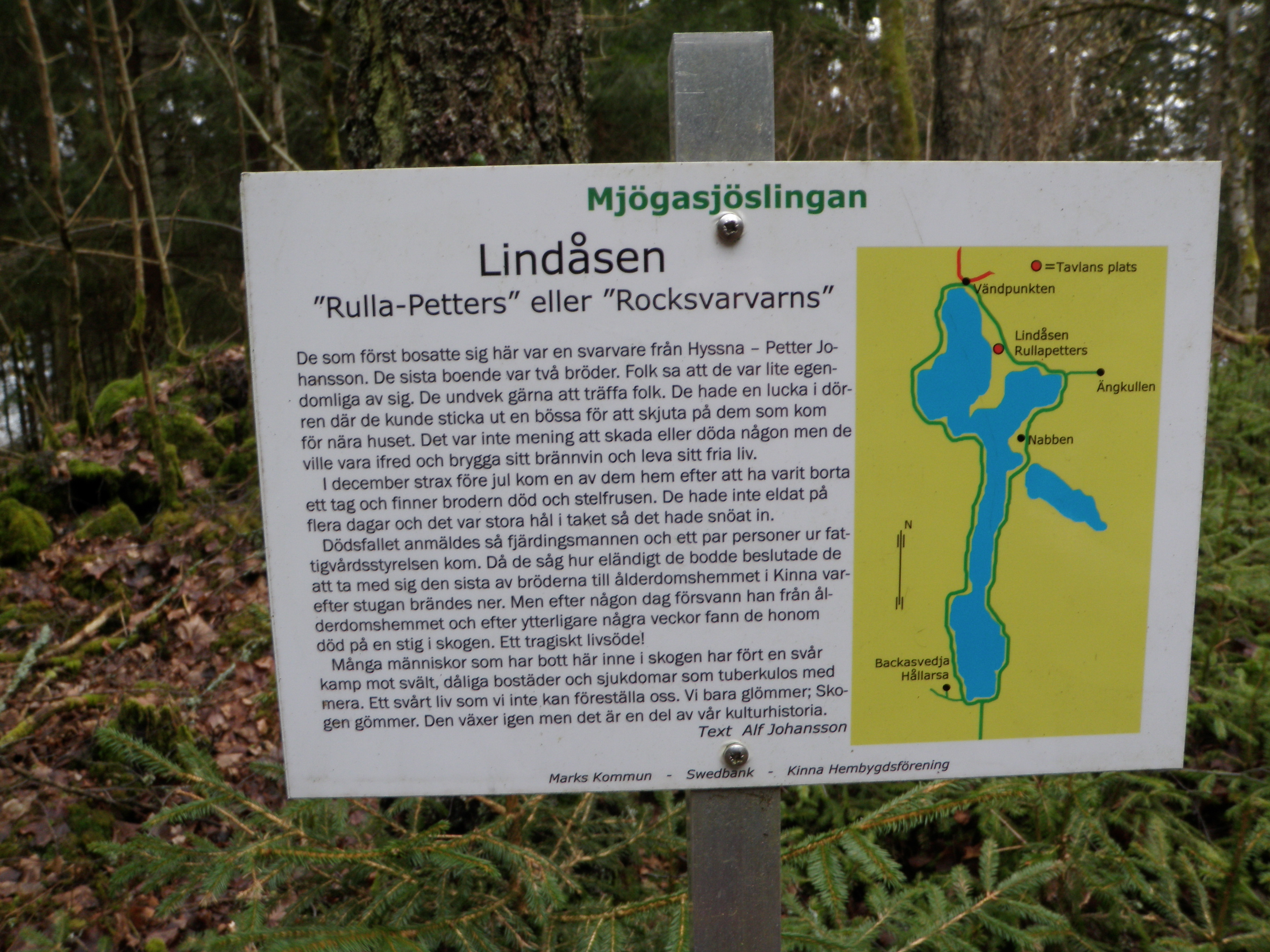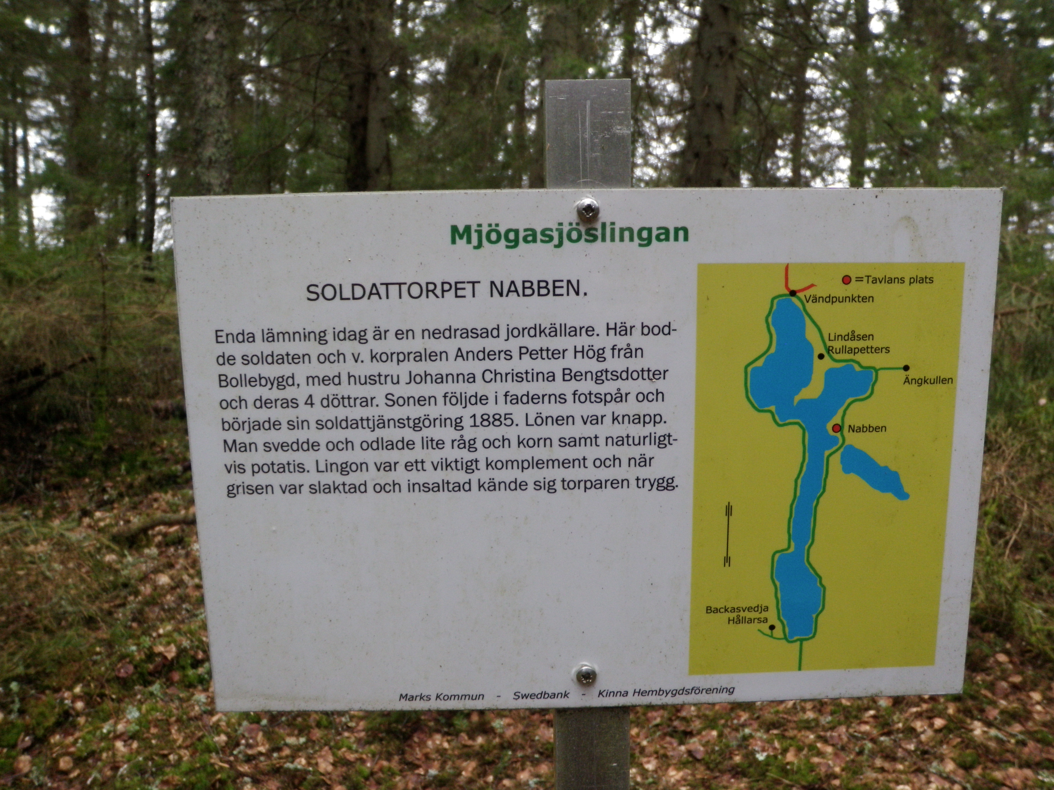 Det var en mycket fin tur runt sjön. Förutom burkar kunde man här och där hitta små informationsskyltar som berättade om områdets torp. Sånt sätter jag stort värde på och skyltarna fotograferades givetvis.
