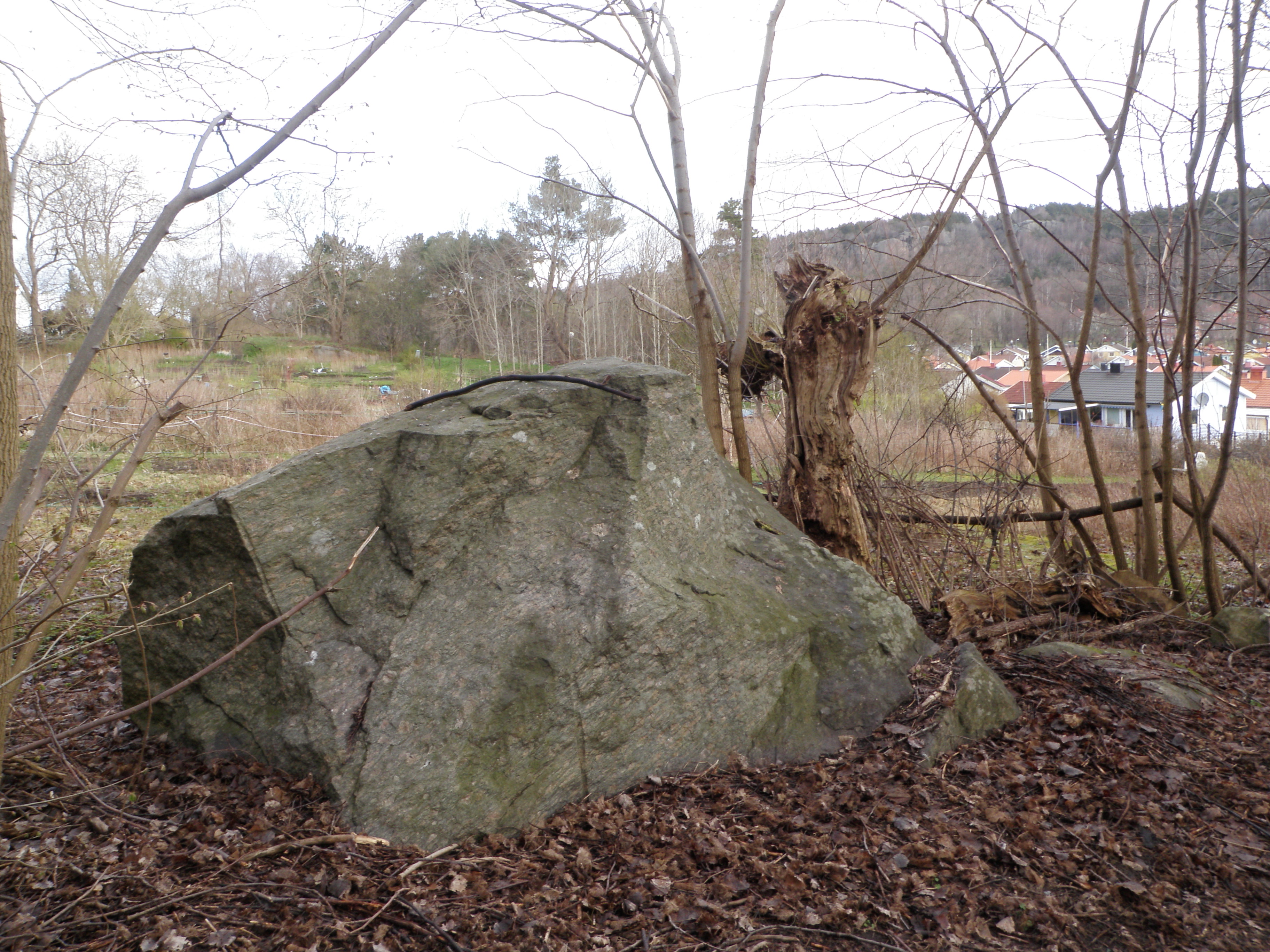 En dryg kilometer bort låg nu ”Gamla Kojans Sten”. Jag trodde att jag valt en bra väg, men så var det inte! Jag fick krypa, hoppa och klättra innan jag kom fram och såg en lämplig gångväg som kom fram mellan husen. Hade jag svängt av en gata tidigare hade jag sluppit stenblocksäventyret. Nära cachen stod en kvinna och tittade på sin telefon, sen började hon titta under stenar – en geocachare! Jag hälsade och frågade om hon också geocachade, ja, sa hon, men letandet var inte så intensivt. Hon hade gått från platsen när jag satt och loggade burken.