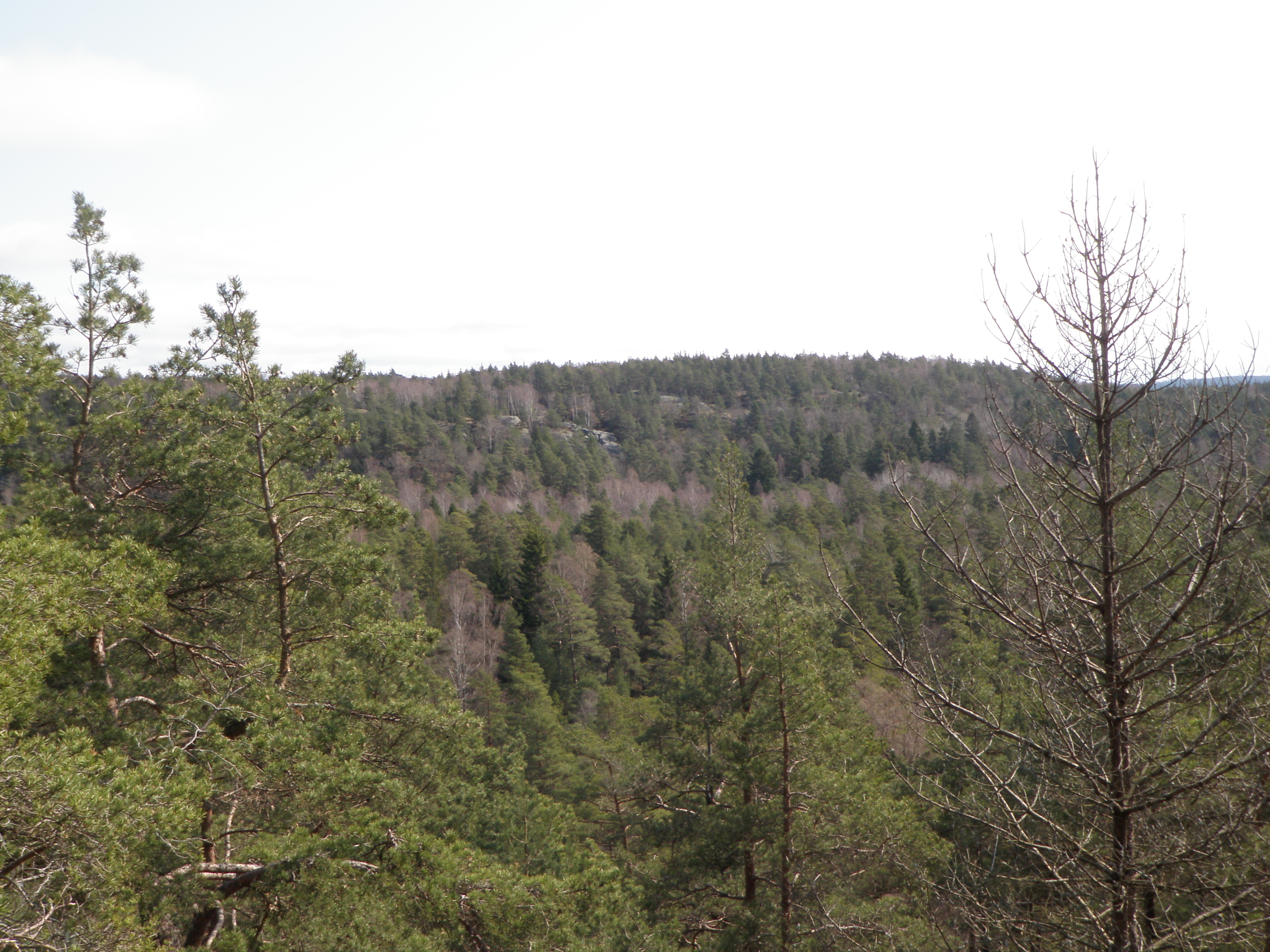 Fågelvägen var det nu 990 meter till ”Topp stenen” som var mitt nästa mål. Vägen dit var dock inte rak, mycket upp och ned, fram och tillbaka. Ingen tid att förlora, bara att ge sig i kast med skog och mark och leta sig fram mot målet. Till en början var det obanad terräng, men en väg med lite mindre lutning valdes ned från berget. Min fart var god genom skogen och snart nådde jag nästa eftertraktade utsiktspunkt. Den cachen var lätt att hitta och jag kunde slänga en blick ut över Partilles dalgång.