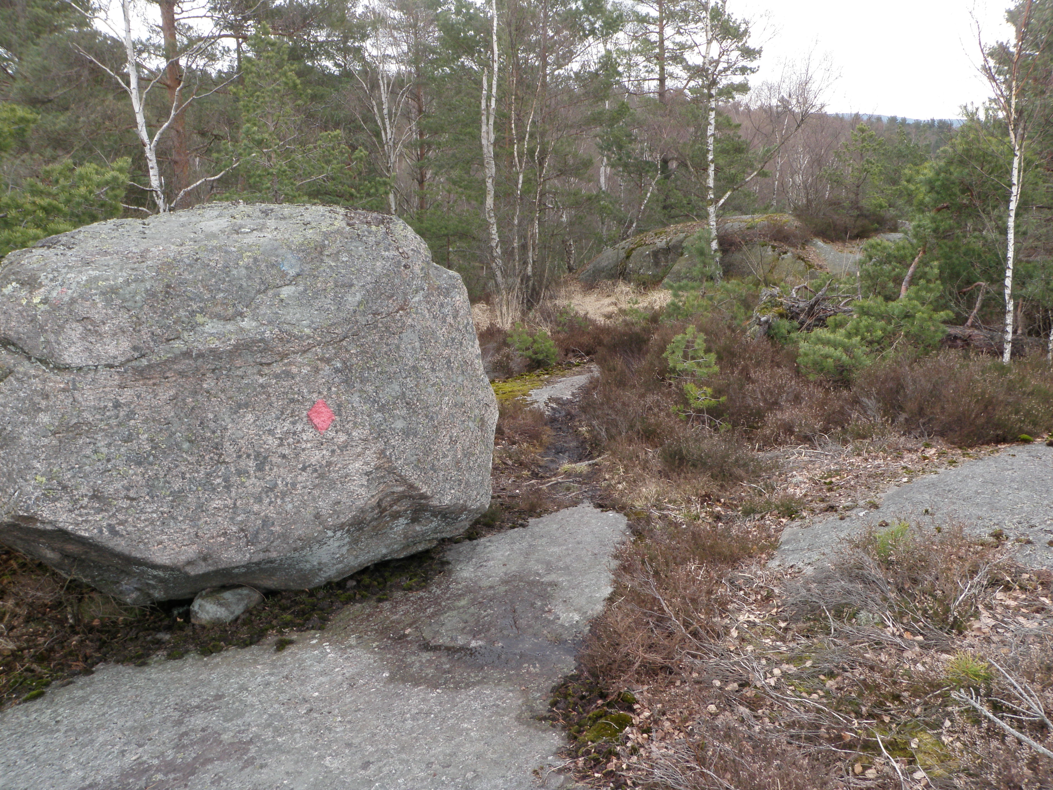 Om man följer stigarna är det de röda markeringarna man skall leta efter.