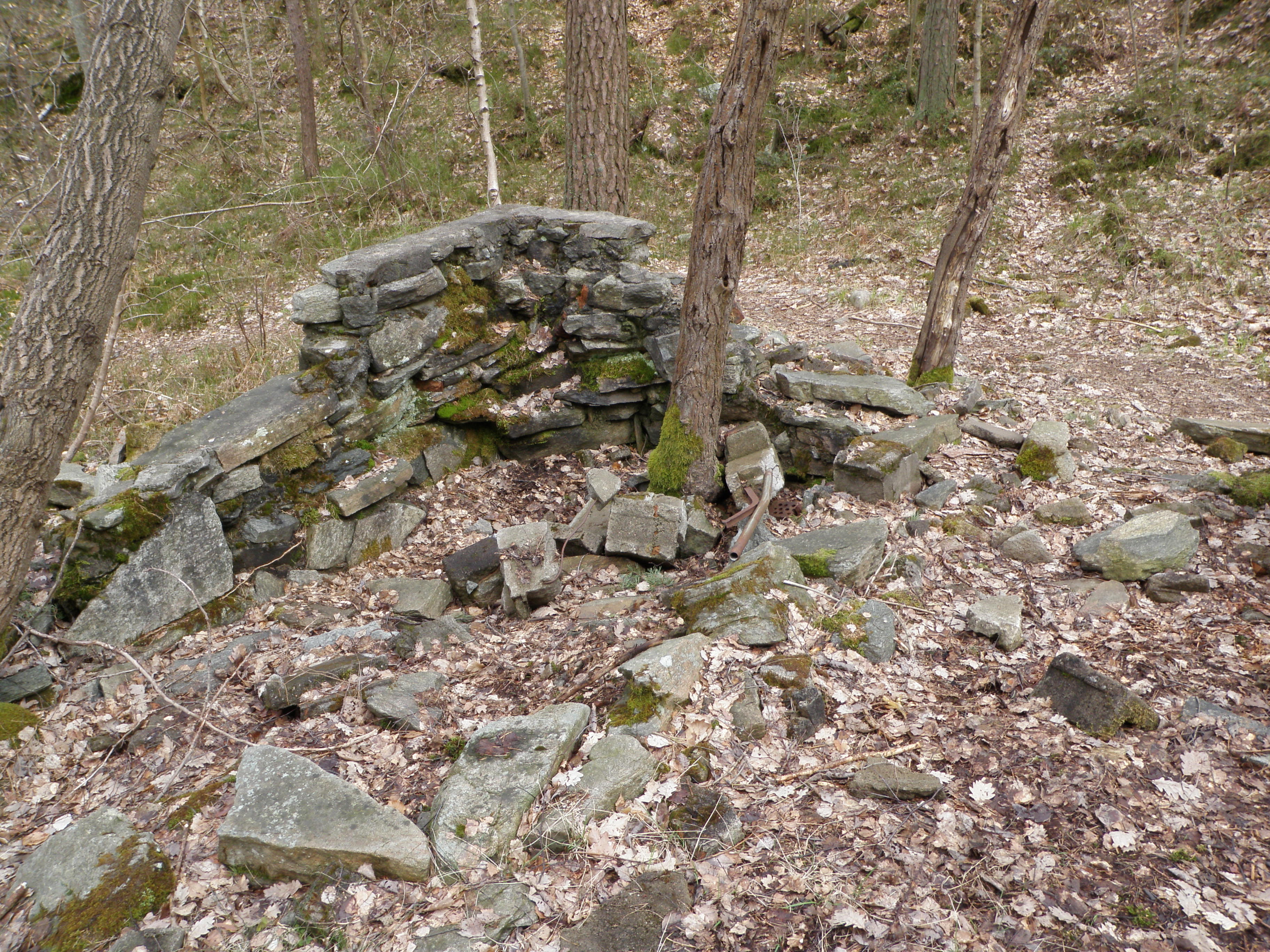 Ned från det höga berget gick jag på leden. Min plan var att följa den röda markeringen, men en bit ned fanns fler leder och en av dessa verkade gå ned i en dalgång som gick i riktning mot radhusområdena vid Lexby. Jag följde stigen och hittade då en bra väg, rakt mot Porthälla. Perfekt, där har man ju en lämplig gångväg rakt mot dagens sista cache, ”Pontus 6 år”. Backarna upp mot cachen är rejäla, men det skadar aldrig att finslipa formen lite! När jag anlände till platsen, som visade sig vara en ruin efter ett hus, kunde burken snabbt lokaliseras.