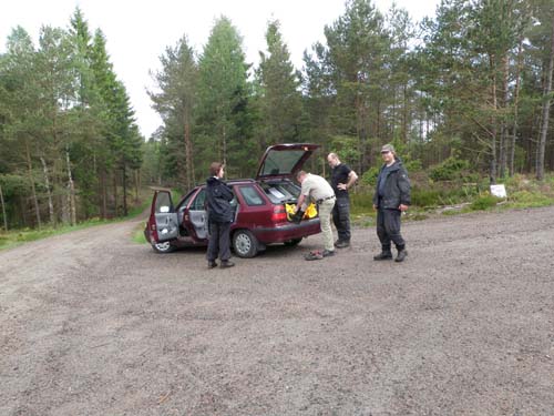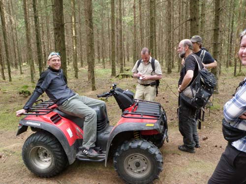 När vi nådde fram till ”Myrslokarnas halv mil #3” fick vi problem, liksom tidigare jägare haft. Vi sökte länge, vi gick till och med så långt att vi delade upp området i sektorer och sökte systematiskt av området! Efter ett samtal till cacheägaren kunde vi konstatera att burken var borta och vi fick ge upp och fortsätta mot nästa burk. När vi nått fram till nummer 8 i serien hör vi ett motorljud….. En fyrhjuling närmar sig snabbt bakifrån!