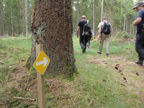 Nästa vandring skulle bli utmed ”Myrslokarnas halv mil #1”. Där är det viktigt att följa den gula markeringen, på cachesidan finns denna information: