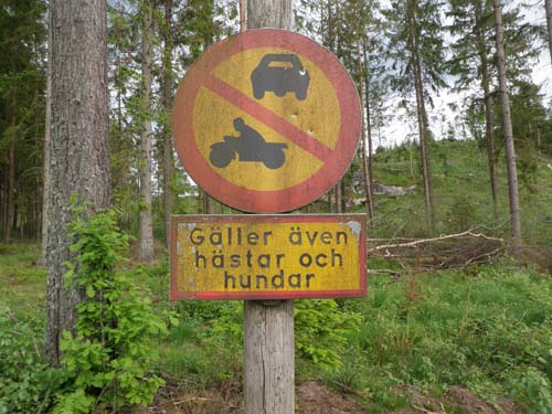 Har även ett kort på förbudsskylten jag med, tycker den är underbar. Sonen blev lite förbryllad när jag informerade honom om att inte ens hästar och hundar får köra motorfordon i terrängen i Torestorp.