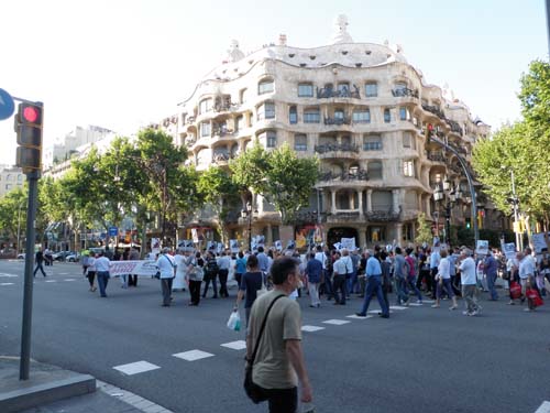 Dagen avslutades med ”La Pedrera”, ett av Barcelonas mer berömda hus. Där snurrade jag och mugglar-Malin omkring länge innan vi kom till rätt plats. Mitt under loggningen spärrades gatan av och ett mindre demonstationståg drog förbi, protester mot nedskärningarna. Inte konstigt, alla offentligt anställda och alla pensionärer har fått rejält sänkta inkomster den senaste tiden.