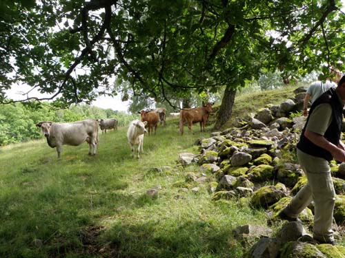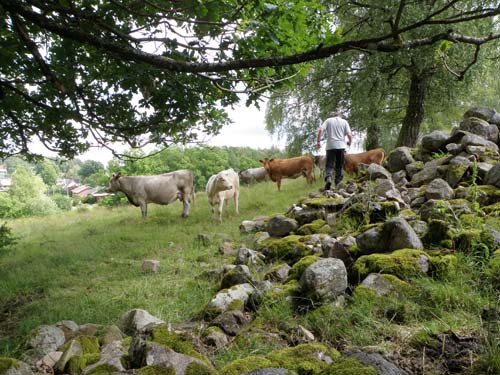 När denna trevliga promenad var avslutad gav vi oss ut på jakt efter lite ”ströburkar” som låg runt om Kinna. En plats med lite extra krydda var ”[Örby] Tjurabacken”. Först fick två elstängsel passeras, ett genom att åla… sedan väntade de synnerligen nyfikna invånarna i beteshagen på oss. Sällan har jag varit så iakttagen i samband med letandet efter en burk. Lyckligtvis fanns det inga tjurar i hagen utan enbart fridsamma kor med kalvar.