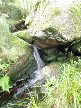När gårdagens alla burkar var loggade kunde jag rejält försenad ge mig ut på en förmiddagstur vid klockan nio. Målet för dagen var blygsamt men ändå viktigt, att logga den nyligen publicerade cachen ”Finngösabäckens vattenfall”. Det är lite över tre kilometer att gå från cachingbasen, alltså inte ens en ordentlig uppvärmningssträcka. I god fart tog jag mig fram till vattenfallet. Vägen dit går på trevliga små skogsstigar, vid N57 43.567 E12 06.228 passeras lämningarna efter torpen Björnåsslätt. Idag är det bara stenmurarna kvar, övervuxna av tjock växtlighet, men det syns ändå att där legat ett hus.