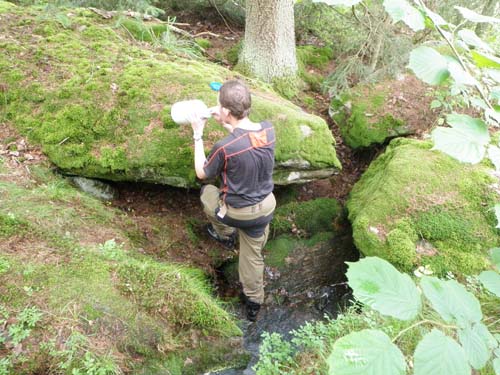 När jag tagit mig högst upp i backen invid vattenfallet dröjde det inte många minuter innan burken var hittad. Nära invid cachen hittade jag blåbär, riktigt härligt att slå sig ned i sluttningen och njuta av bären – det är riktig sommar!