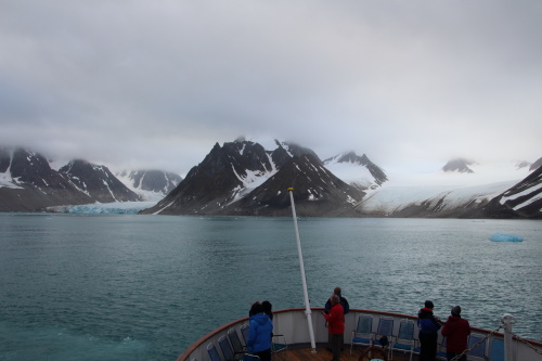 Helt enligt tidtabell seglade vi in i Magdalenefjorden klockan 6 på onsdag morgon. Det är kanske den mest välkända fjorden av alla på Svalbard då den är bred och djup nog även för stora kryssningsfartyg – även de långt större än Nordstjernen. Det var också denna fjord som Willem Barentz, den holländska upptäckaren, besökte 1596 under sin upptäckt av Spetsbergen. Namnet kommer av alla spetsiga bergstoppar. Det var kanske väl att han inte råkade segla lite längre norrut för då hade han sett platta berg – Plattbergen – låter inte riktigt lika bra och vad det blir på norska skall jag inte skriva…. Det finns påståenden om att Barentz inte var först på plats – därför vill jag nu hävda att det är Hallén som upptäckt området!! Detta borde kallas Halléns land (för att skilja det från Hallén-land).