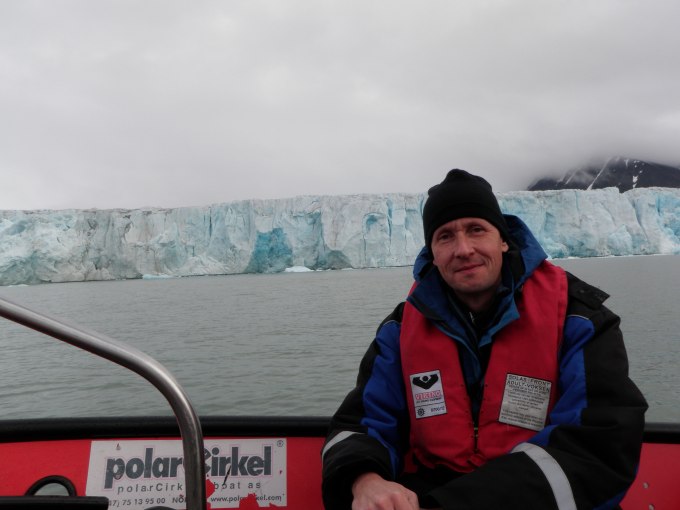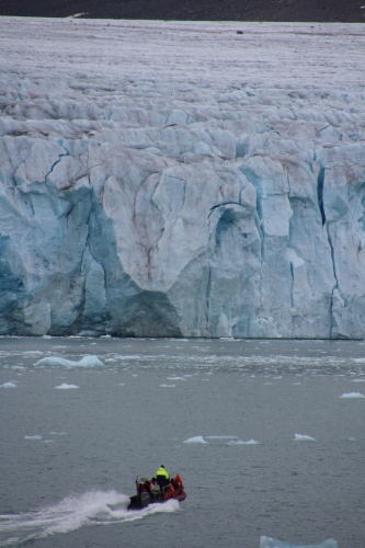 Idag skulle vi inte gå iland, det skulle istället bli en kryssning i småbåtar invid glaciären. Redan innan vi kommit ned till båtarna hörde man åsklika dån och såg vita moln av iskristaller när det mäktiga istäcket kalvade ut i fjorden. Mäktigt men samtidigt lite skrämmande att tänka på att det snart var dags att närma sig denna vägg av is i en liten båt!