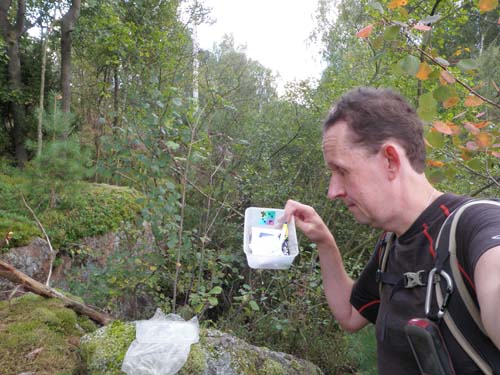 Första lådan på turen blev ”skreva”, jag var lite oroad när jag såg att kontot hade två utlagda men inga hittade burkar. Dessutom hade koordinaterna redan uppdaterats en gång. De senaste besökarna hade ju ändå hittat cachen, alltså gjorde jag ett försök. Min gps fick fullständigt snurren när jag kom till platsen, sällan har jag fått så märkliga felvisningar som här. Givetvis beror det på den höga bergssidan, alltså fick jag använda min burkletarnäsa och då hittades burken.